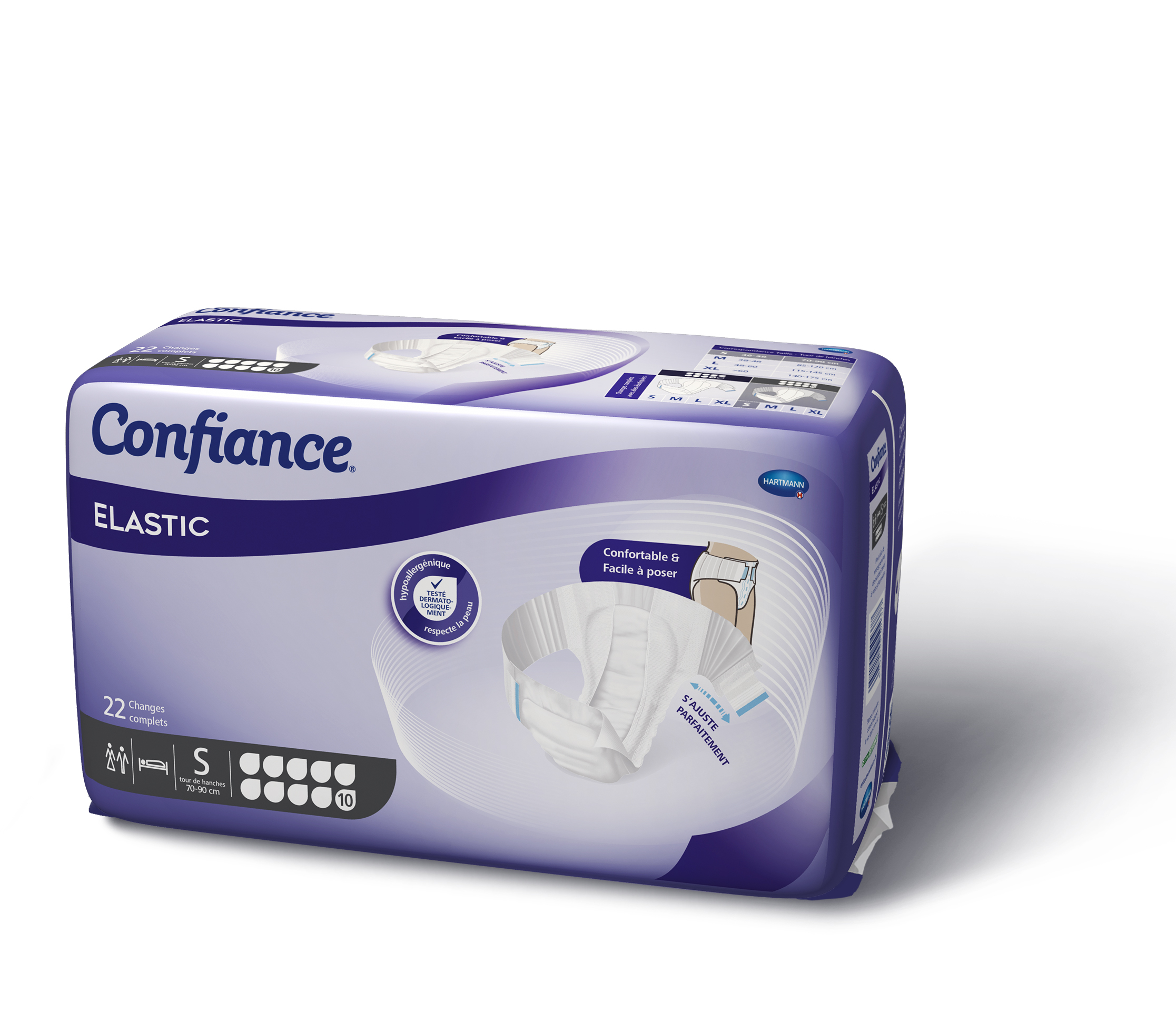 La gamme Confiance® Elastic existe en plusieurs tailles allant du S au XL.