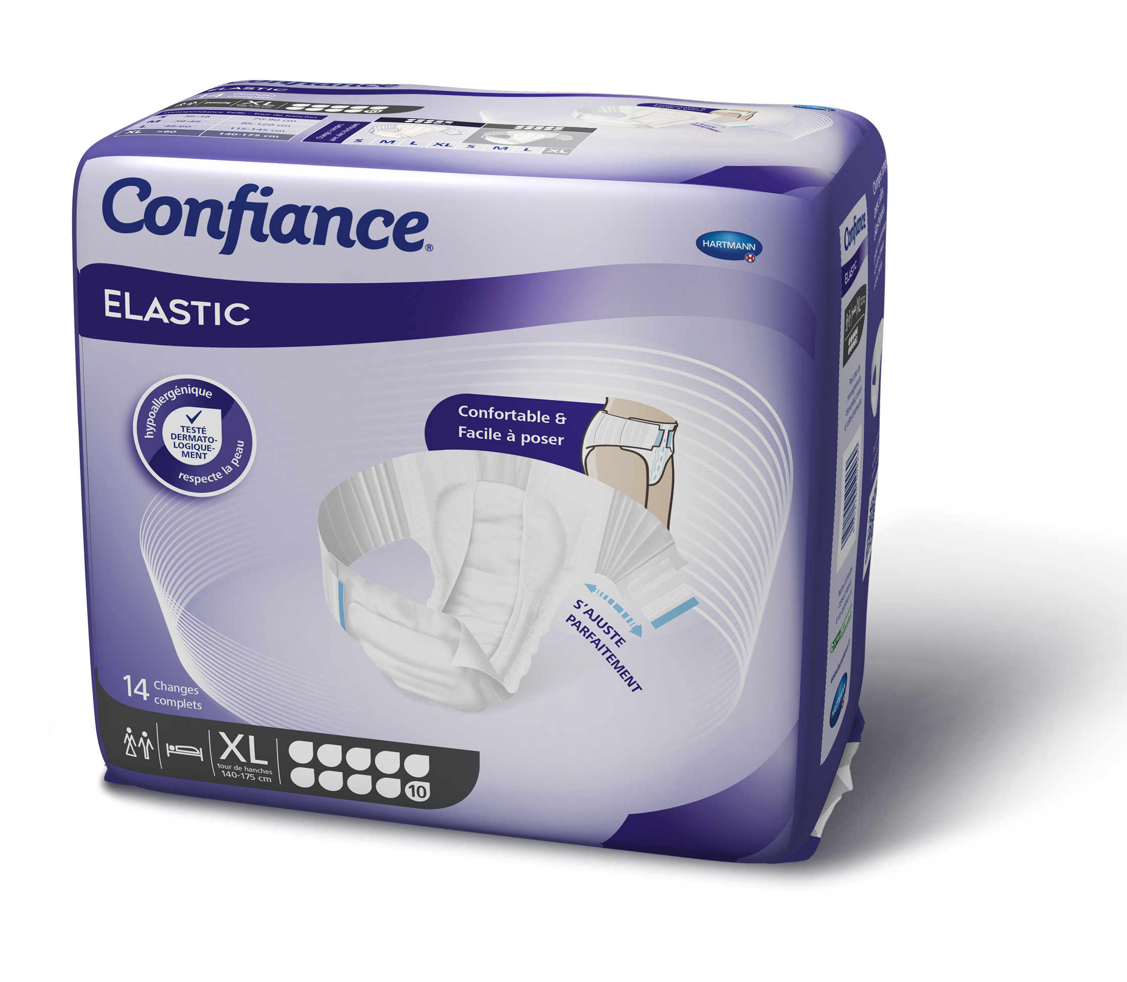 La gamme Confiance® Elastic existe en plusieurs tailles allant du S au XL.