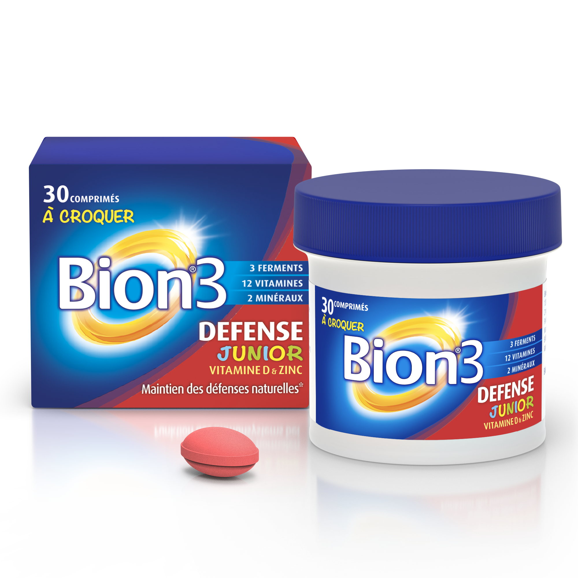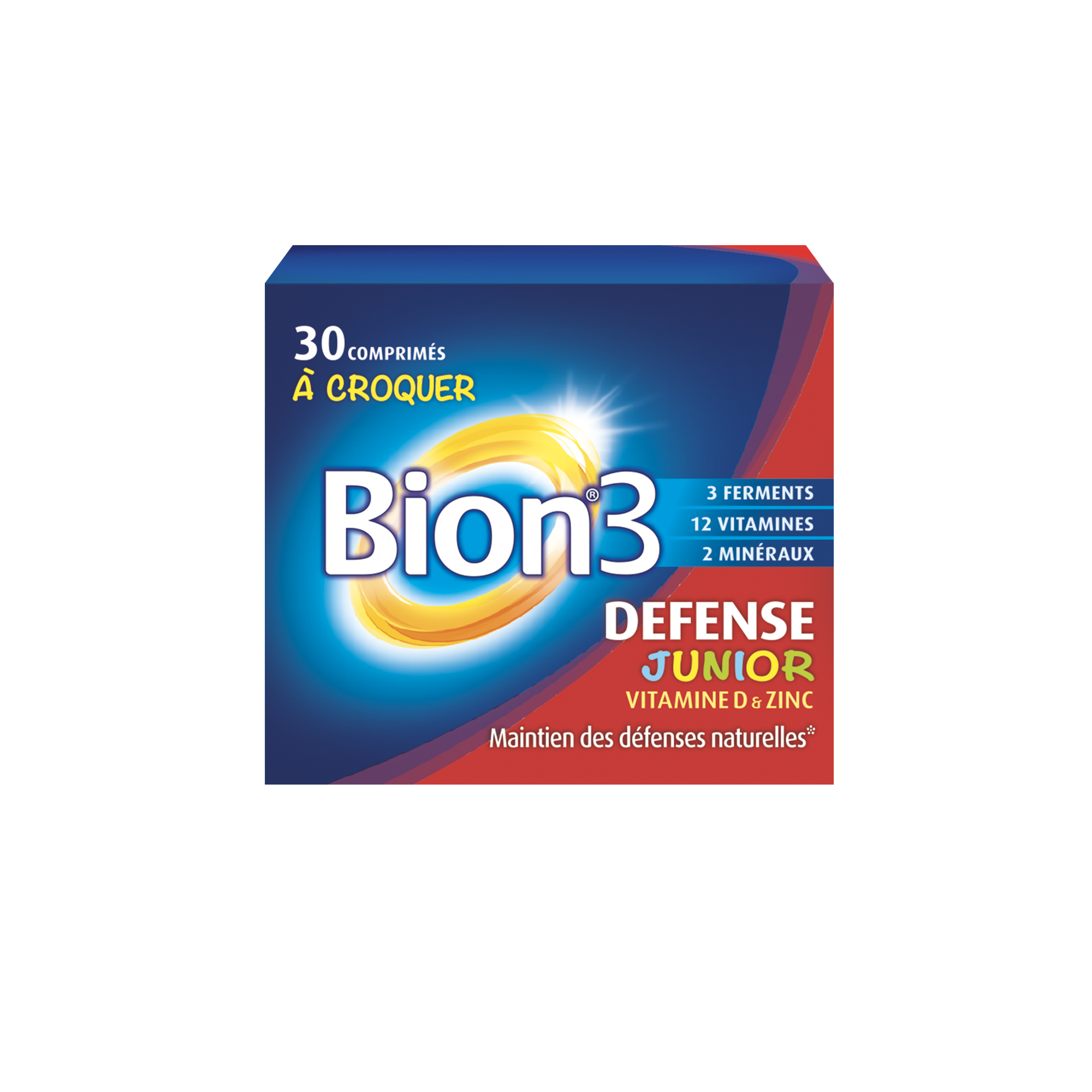 Bion®3 Défense Junior est un complément alimentaire qui permet aux enfants dès 4 ans de maintenir leurs défenses immunitaires. Il contient une association unique de ferments microbiotiques, de vitamines et de minéraux dont la vitamine D qui contribue au fonctionnement normal du système immunitaire.