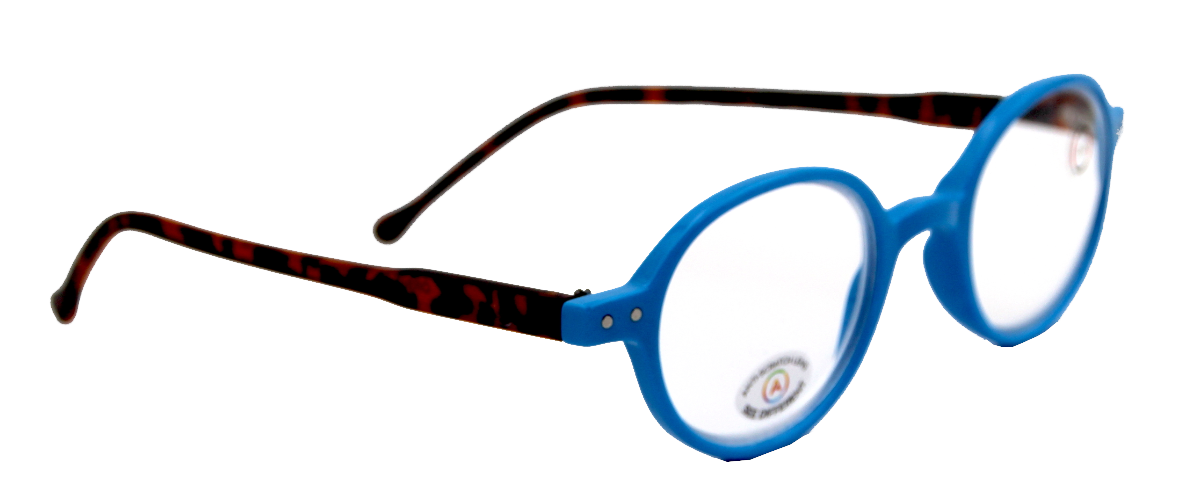 La paire de lunettes loupes Orbit de forme ronde et de coloris beu et marron offre une correction +1.00. Ces lunettes loupes traditionnelles colorées et modernes ne filtrent pas la lumière bleue.