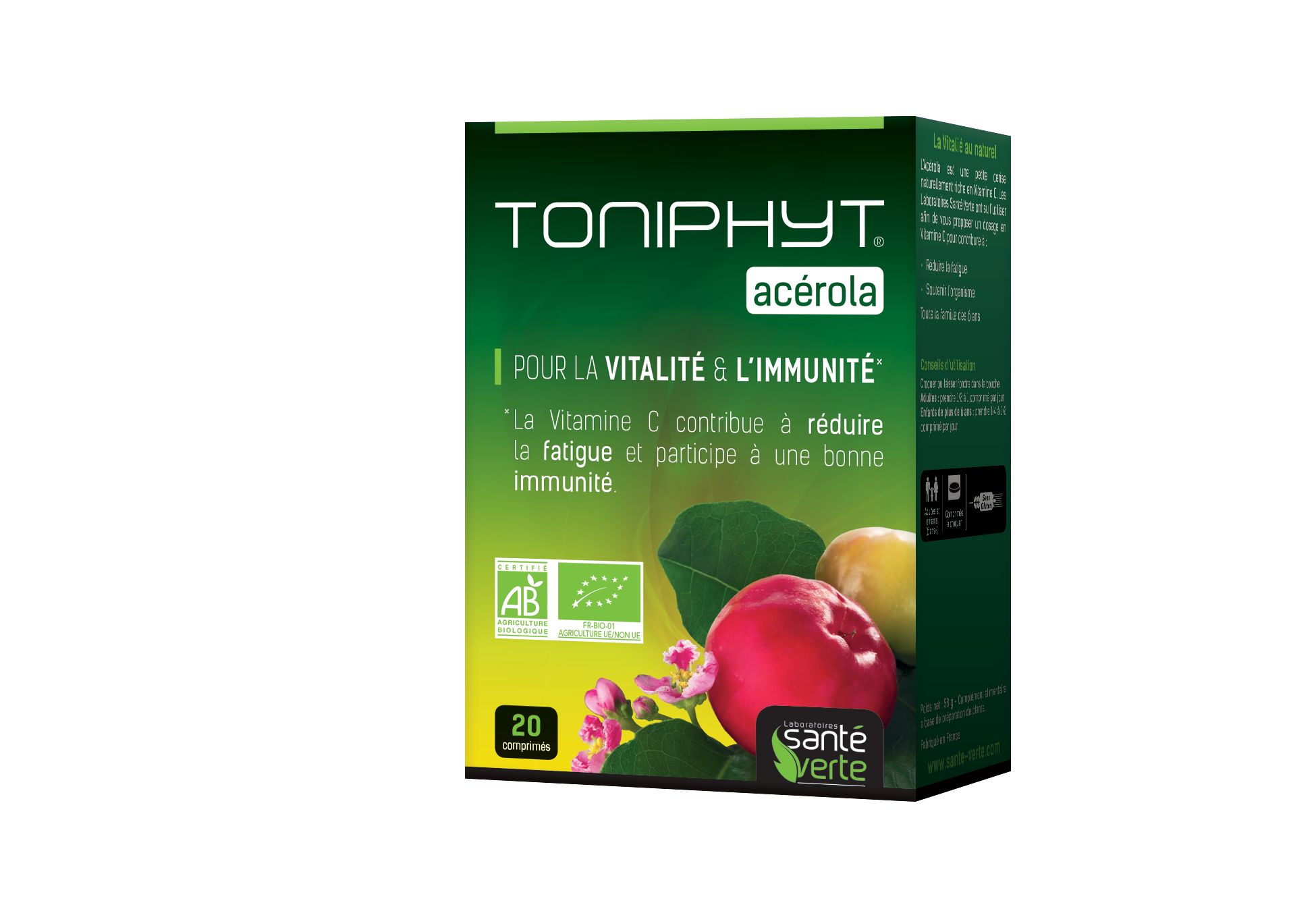 Acérola Bio Toniphyt du laboratoire Santé Verte est un complément alimentaire sous forme de comprimé. Sa formule d'origine naturelle et composée à 17% de vitamine C contribue au bon fonctionnement du système immunitaire et à la réduction de la fatigue.