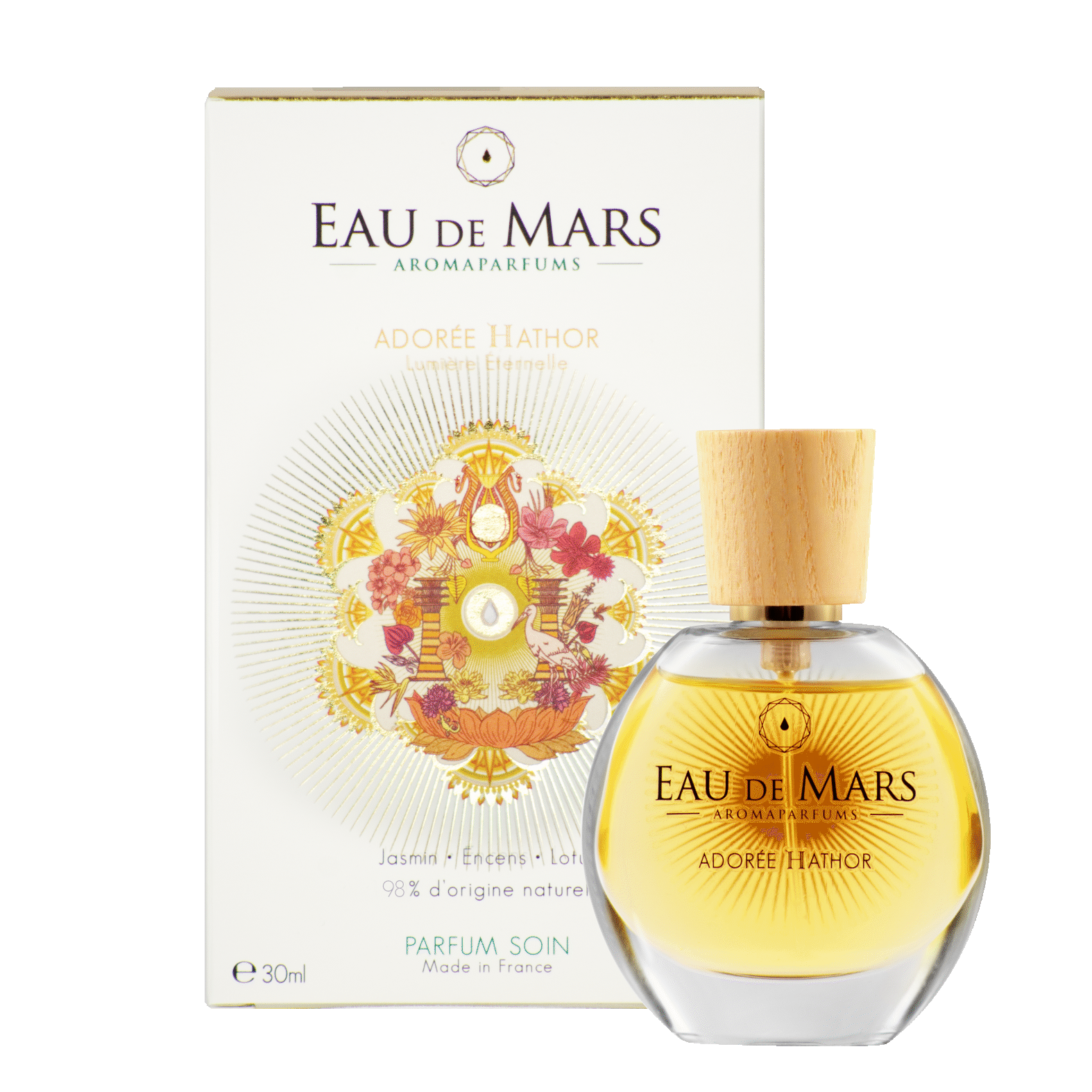 Adorée Hathor est une eau de parfum au jasmin naturel, aux huiles essentielles et à l’eau de source harmonisante de Saint-Genulphe.