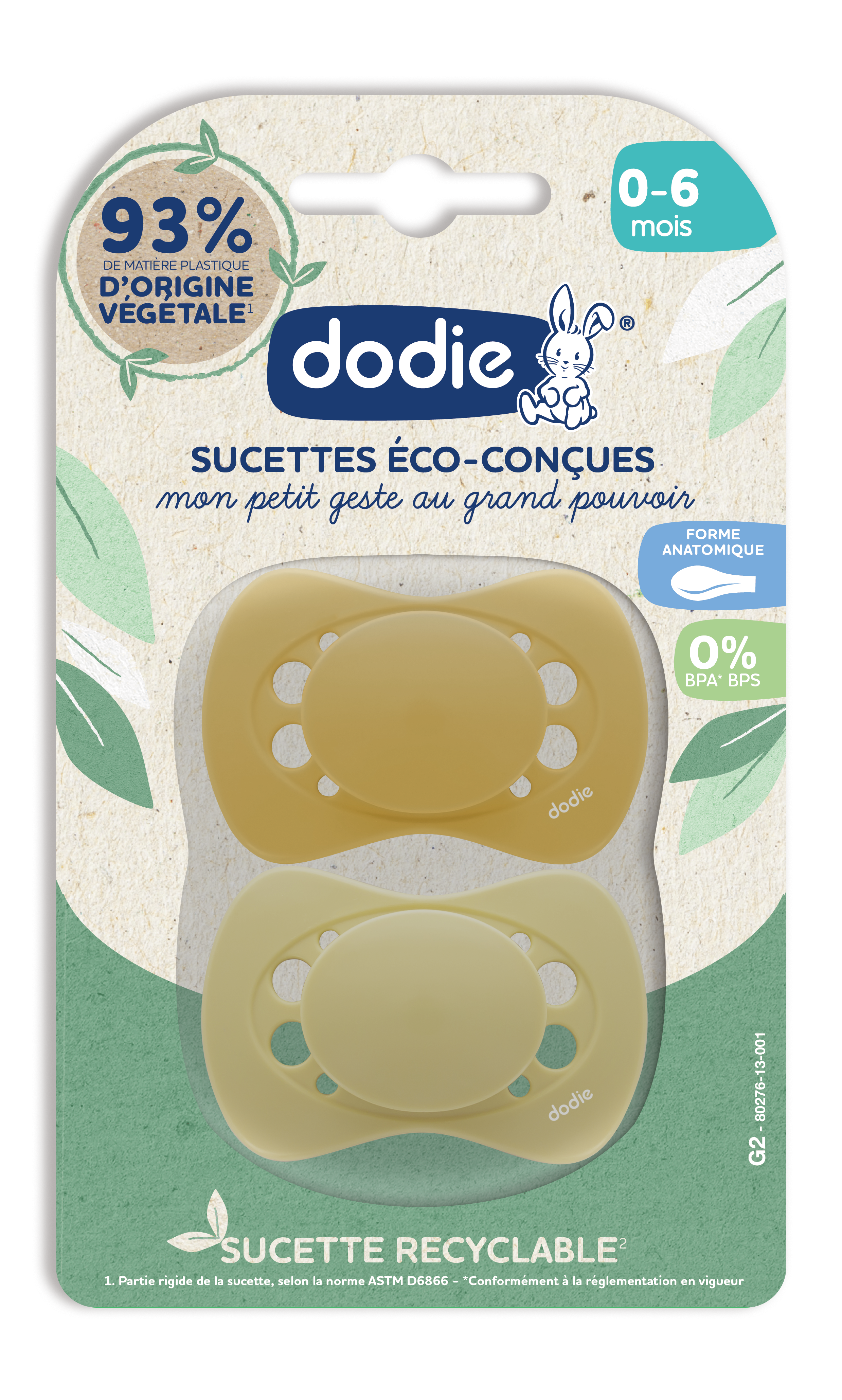 La sucette anatomique éco-conçue Dodie est composée d'une tétine recyclable grâce à la matière plastique biosourcée d'origine végétale provenant de la canne à sucre.