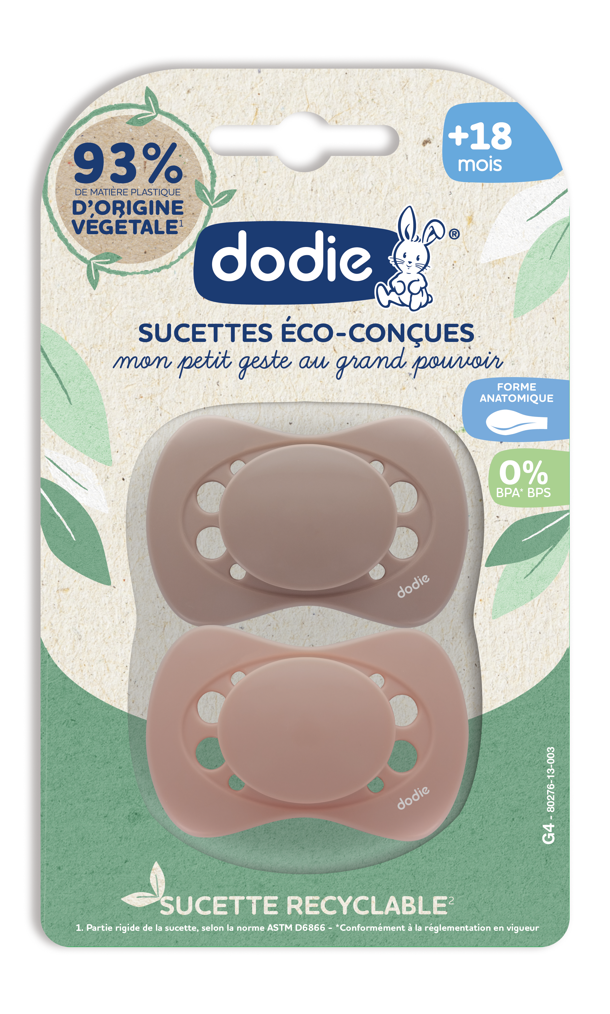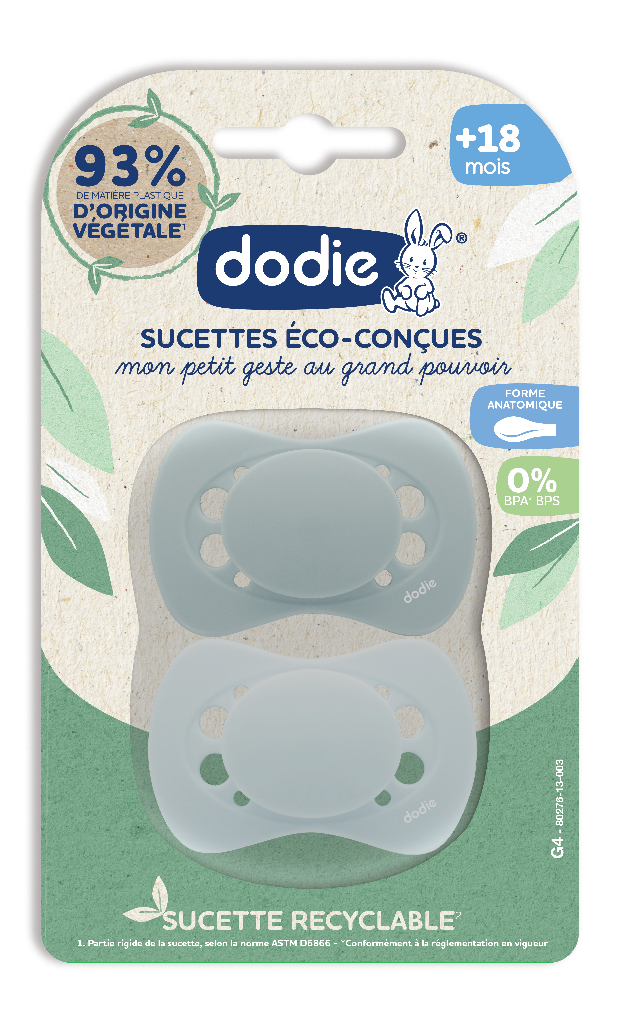 La sucette anatomique éco-conçue Dodie est composée d'une tétine recyclable grâce à la matière plastique biosourcée d'origine végétale provenant de la canne à sucre.