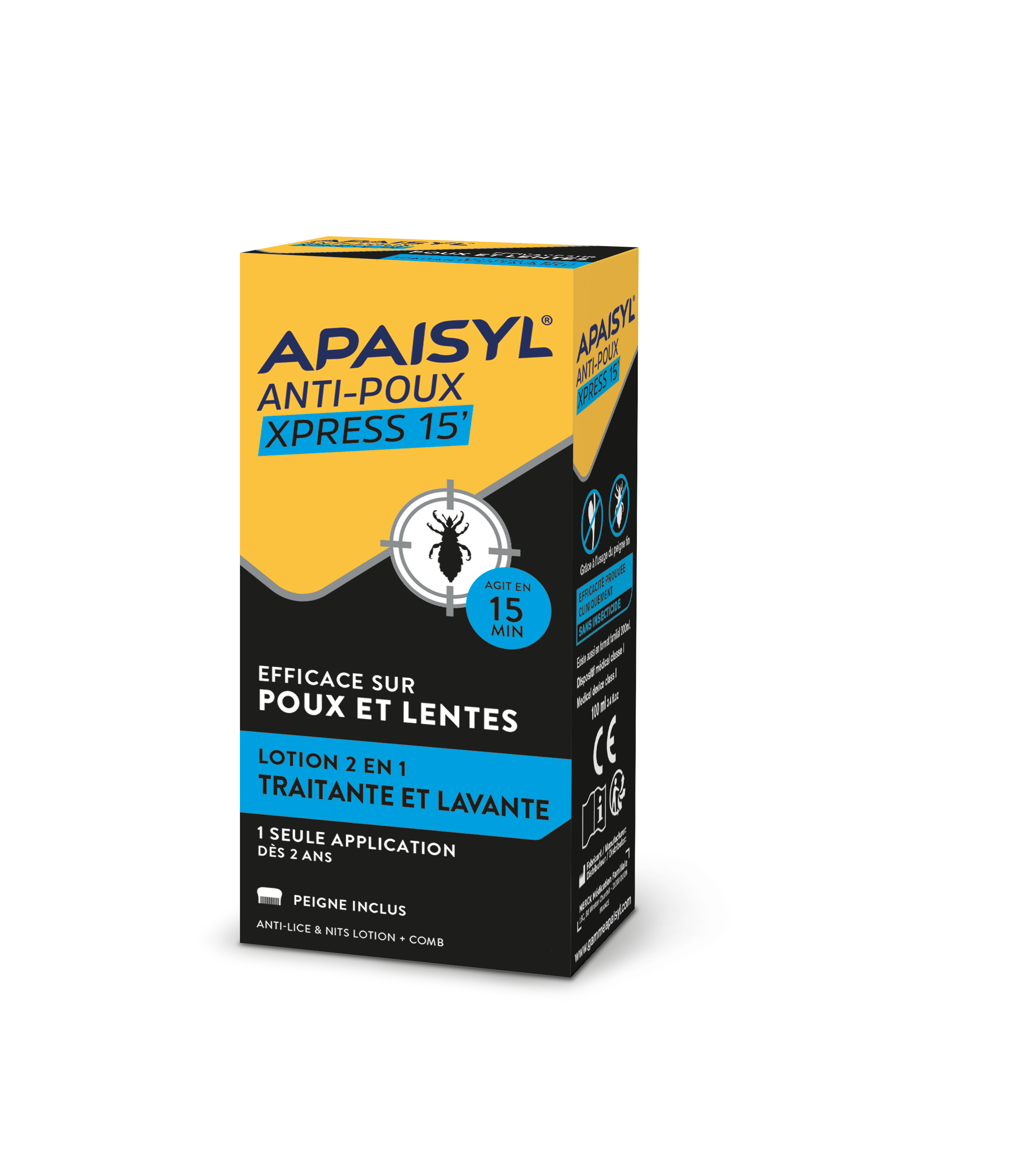 Apaisyl® Anti-Poux Xpress 15' est un traitement anti-poux et lentes composé d’une lotion sans insecticide chimique et d’un peigne fin. Son efficacité a été démontrée en 15 minutes de pose et en une seule application*.