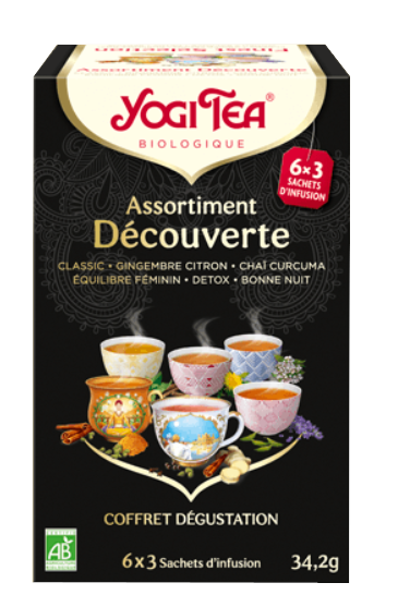 Yogi Tea Assortiment découverte est composé de 6 infusions différentes aux plantes composée d'ingrédients issus de l'Agriculture Biologique.
