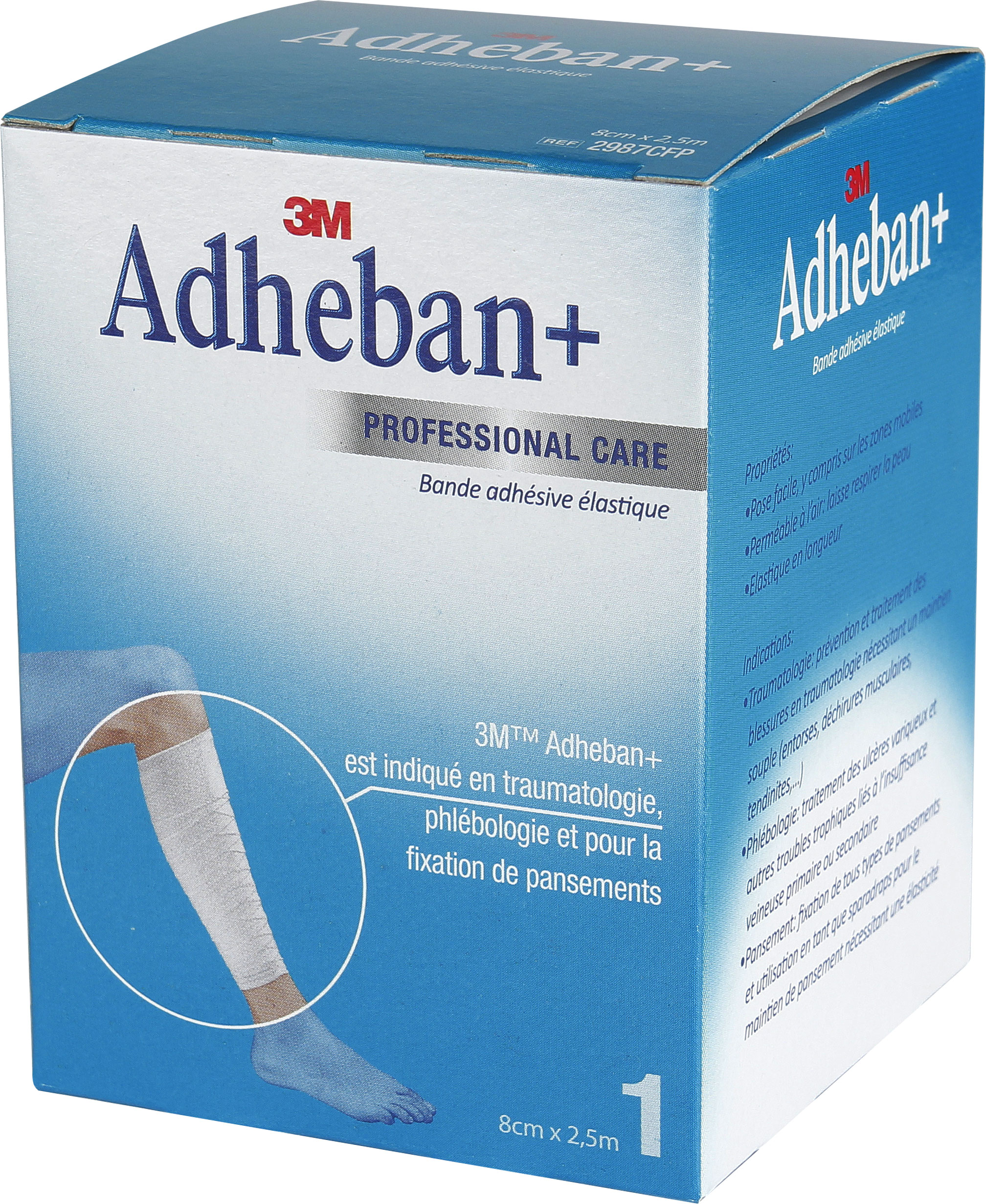 La bande adhésive élastique 3M Adheban + peut être utilisée en traumatologie (entorse, tendinite...) pour la phlébologie et pour maintenir et fixer les accessoires médicaux.