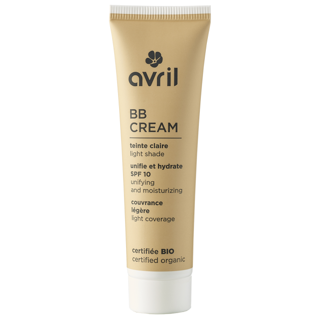 La BB cream Avril en teinte claire est certifiée bio. Dotée d'un SPF10, elle hydrate et unifie le teint pour une couvrance légère. Elle est antioxydante et facile à appliquer. C'est un produit végan avec un tube végétal issu de la canne à sucre.