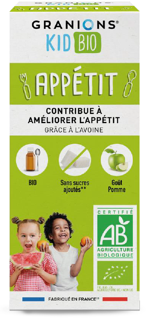 GRANIONS KID BIO APPÉTIT, au bon goût de pomme, est un complément alimentaire BIO sans sucres ajoutés** à base de : fenugrec, avoine, gentiane et gingembre.