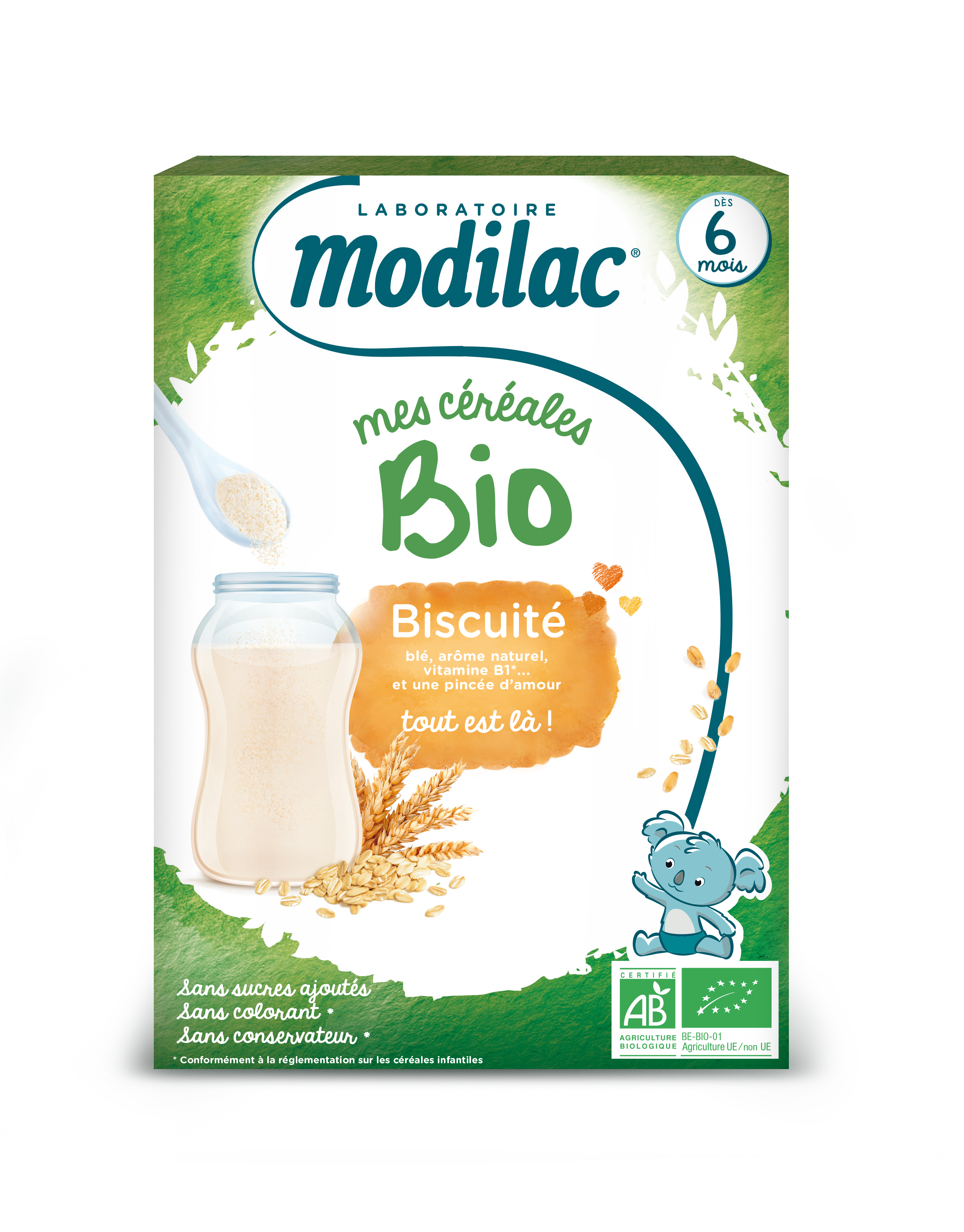 Les Céréales Bio Biscuité Modilac sont fabriquées avec des ingrédients issus de l’agriculture biologique, contenant des sucres naturellement présents, pour une diversification alimentaire en douceur de bébé.