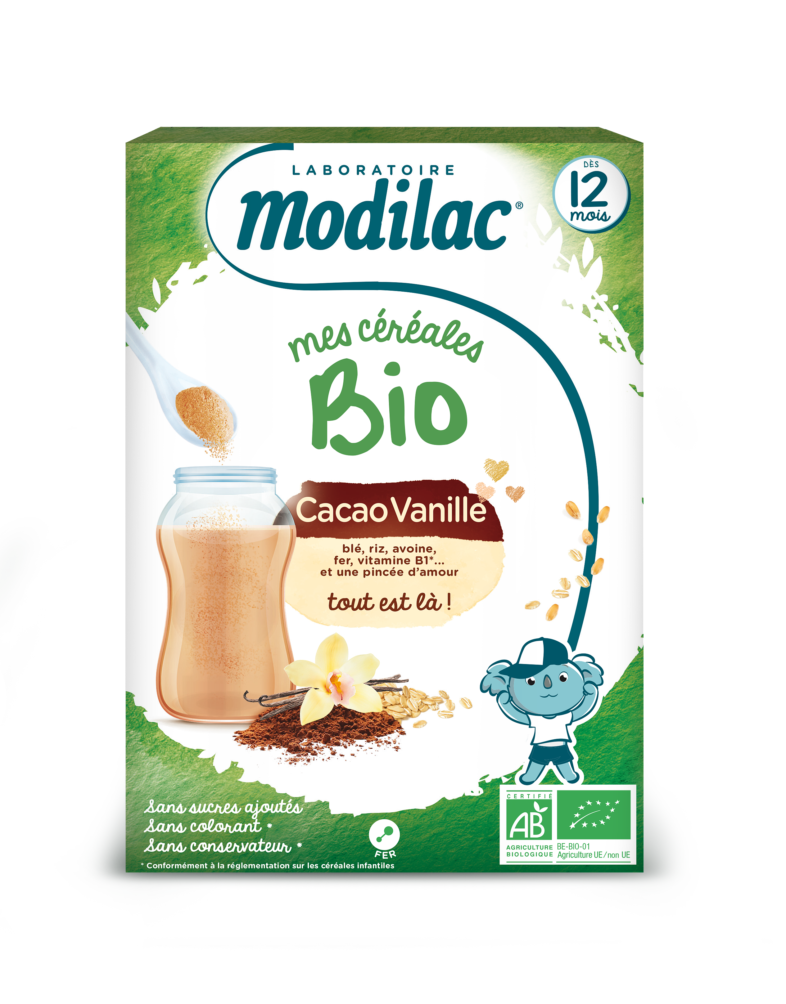 Voir les Ingrédients Farines de céréales (farine de blé partiellement hydrolysée* 78.7%, farine de riz* 8.4%, farine d'avoine* 4.9%), poudre de cacao maigre* 6%, arôme naturel de vanille 1%, pyrophosphate ferrique, vitamine B1. * Ingrédients issus de l'agriculture biologique. Peut contenir des traces de lait. Contient du gluten