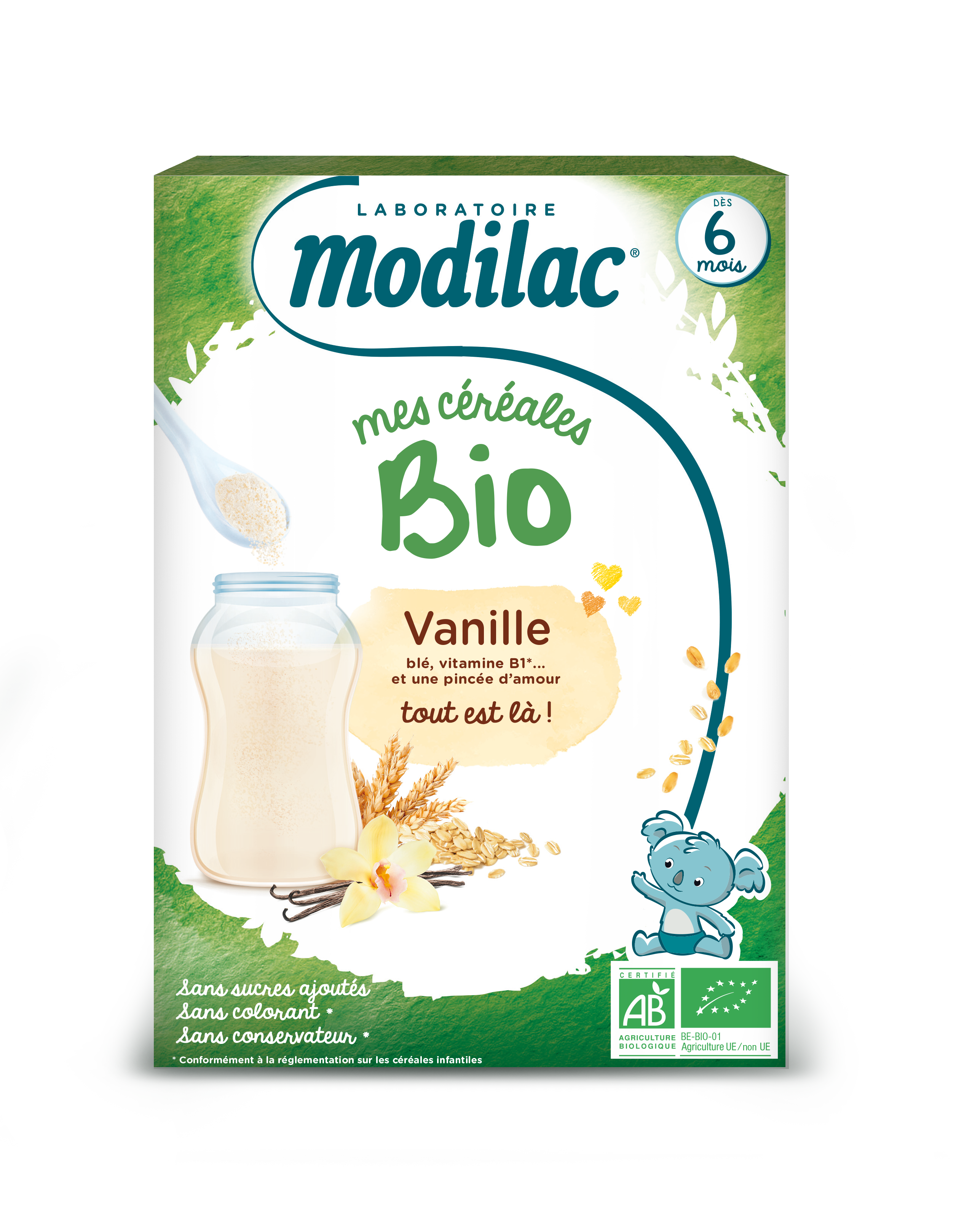 A la découverte de nouvelles saveurs ! Les Céréales Bio Biscuité Modilac sont fabriquées avec des ingrédients issus de l’agriculture biologique, contenant des sucres naturellement présents, pour une diversification alimentaire en douceur de bébé. Dès 6 mois, bébé a de nouveaux besoins liés à son bon développement, pour l’accompagner, nos céréales vont lui permettre :