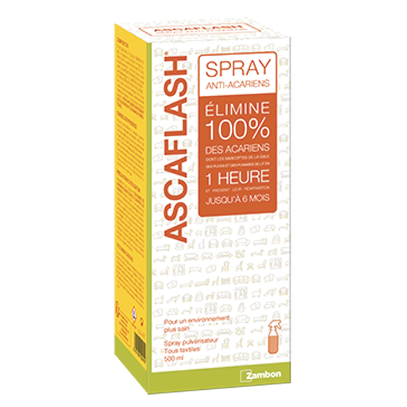 Ascaflash est un traitement préventif et curatif contre les sarcoptes de la gale ou acarines. Il élimine sur les tissus 100 % de ces sarcoptes en 1 heure et prévient leur réapparition jusqu'à 6 mois. Un flacon traite environ 10 à 15m² de tissus. Le produit ne tâche pas et ne graisse pas. Il ne dégage par d'odeur.
