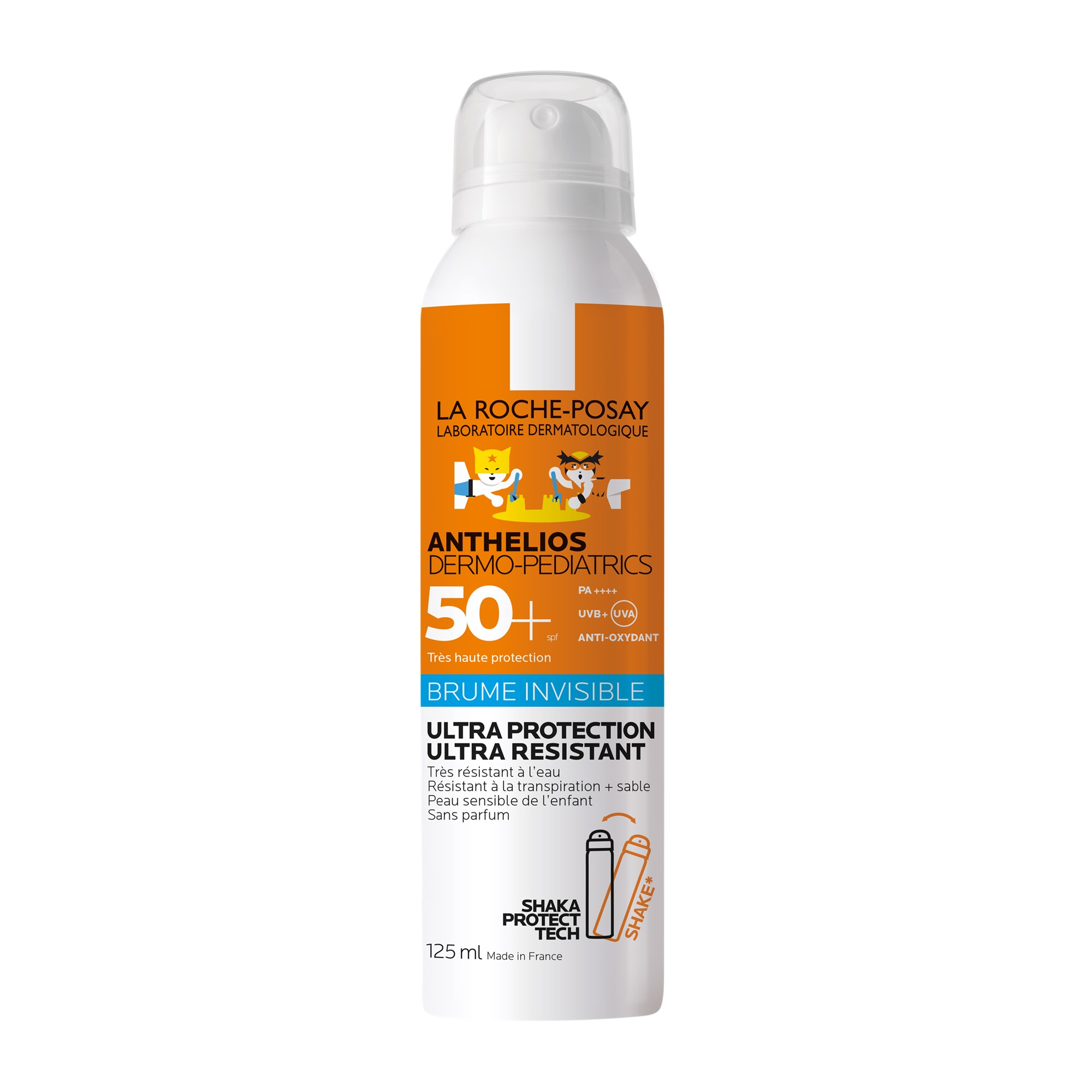 La brume Dermo-Pediatrics Anthelios 50+ de La Roche Posay est une protection solaire pour les enfants à tres haute protection solaire UVA et UVB. Il est résisant à l'eau et au sable ainsi qu'a la transpiration.