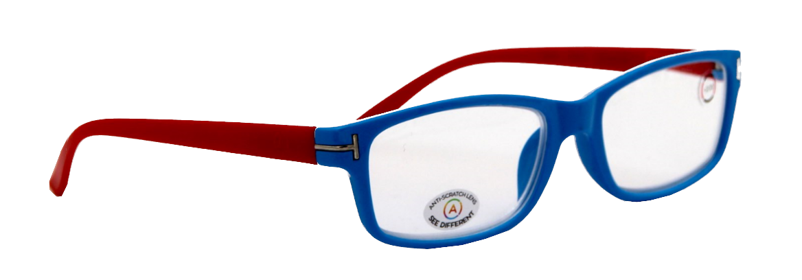 La paire de lunettes loupes Perso de forme rectangulaire et de coloris rouge et bleu offre une correction +1.00. Ces lunettes loupes traditionnelles colorées et modernes ne filtrent pas la lumière bleue.