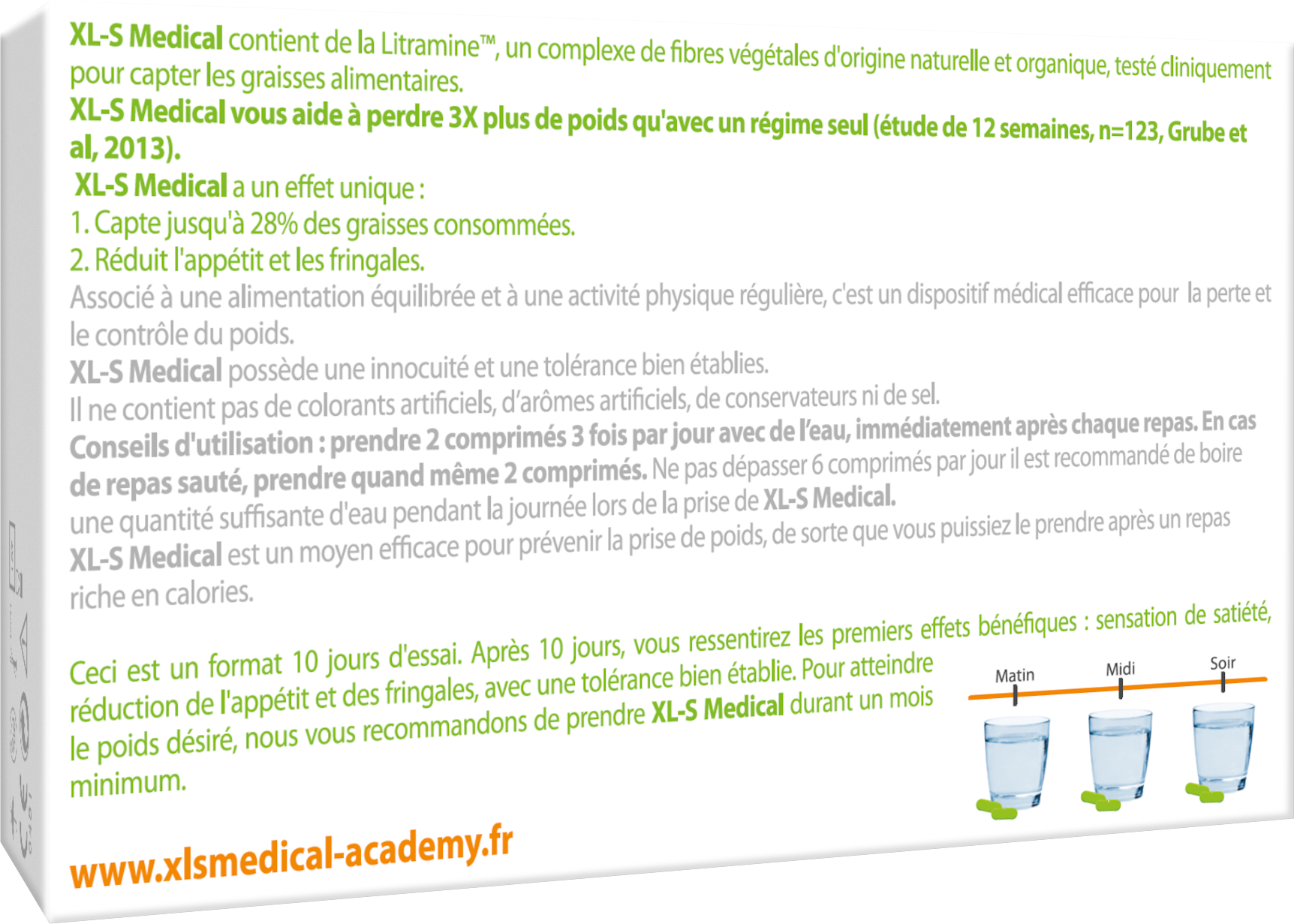 Une aide à la perte de poids efficace : XL-S MEDICAL vous aide à perdre du poids et à capter les graisses grâce à la Litramine®, dont l'efficacité a été cliniquement prouvée.