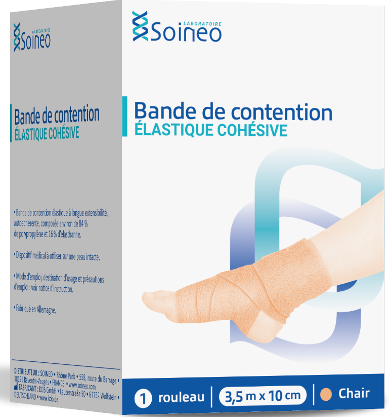 La bande de contention Soineo permet de maintenir des pansements, entorses, tendinites ou phlébologie.