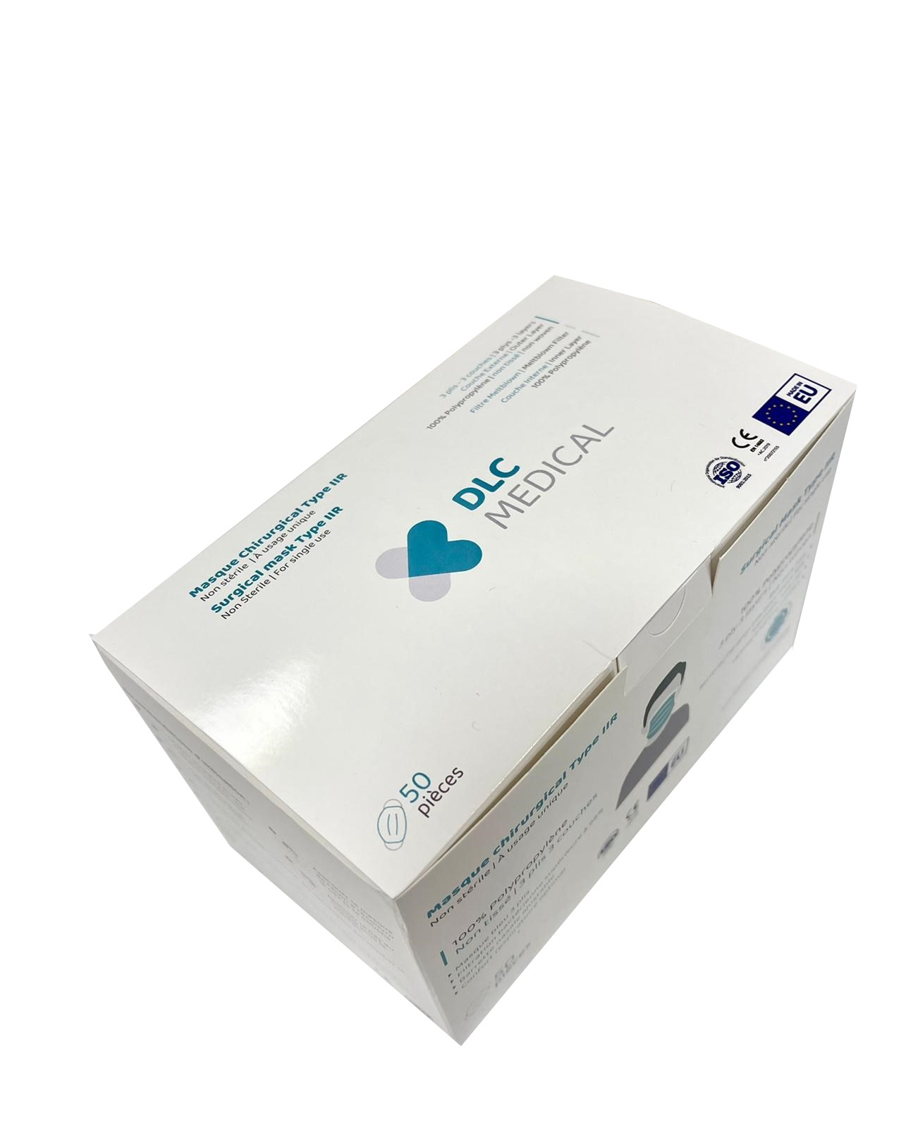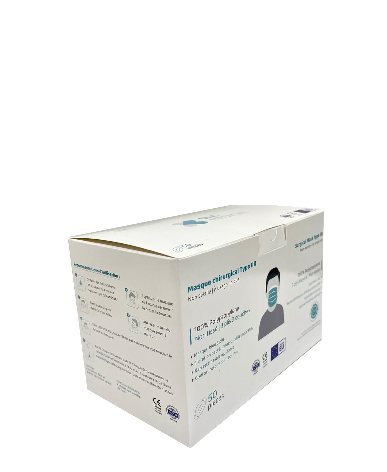 Boîte de 50 masques chirurgicaux de type IIR. Ils sont non stériles à usage unique en polypropylène. Ils offrent une filtration bactérienne supérieure à 98 % et sont dotés d'une barrette nasale ajustable pour plus de confort et de protection. Ils sont certifiés par la norme européenne.