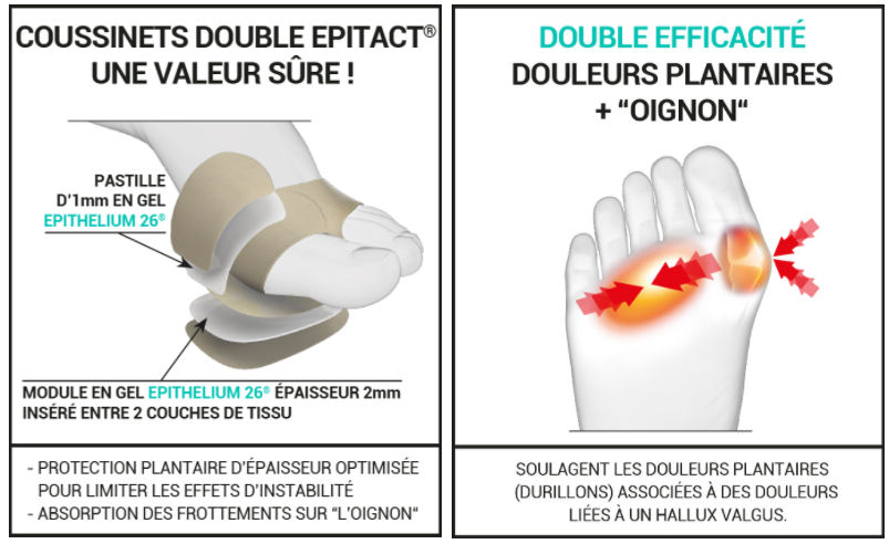 La paire de coussinet Double protection hallux valgus oignon et douleurs plantaires taille S d'Epitact protège et soulage les douleurs sous l'avant du pied et sur l'oignon. Très fins, les coussinets peuvent se porter dans tous types de chaussures, même fermées. Ils sont lavables en machines avec le filet de lavage qui est fourni.