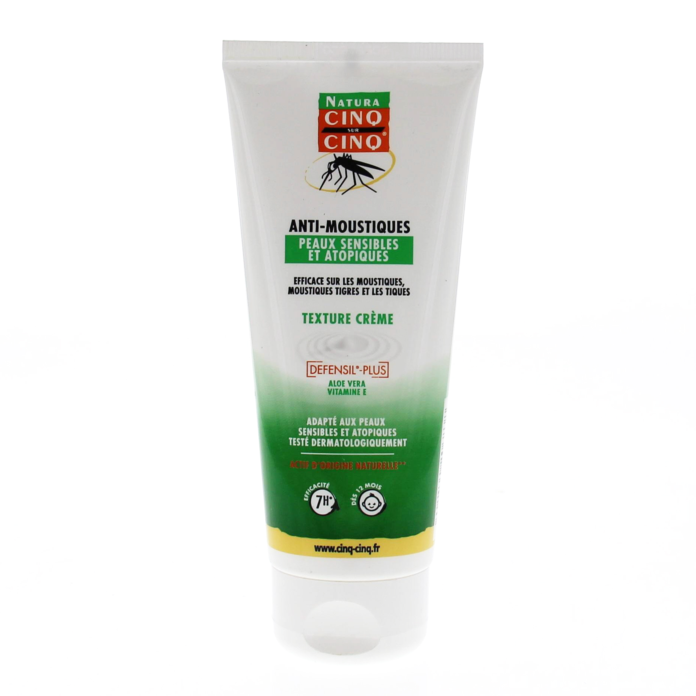 La crème anti-moustiques Peaux sensibles et Atopiques Cinq sur Cinq est un répulsif contre les moustiques locaux et tropicaux jusqu’à 7 heures et jusqu’à 4 heures pour les tiques. Elle est adaptée pour les peaux senisibles.