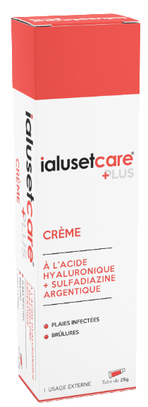 Ialusetcare® CREME PLUS est un cicatrisant à base d’acide hyaluronique (0,2%) et de sulfadiazine argentique (1%), des plaies infectées et des brûlures, des affections dermatologiques primitivement bactériennes ou susceptibles de se surinfecter. L’acide hyaluronique est le composant principal de la substance fondamentale du derme. Il agit à toutes les phases du processus de cicatrisation. Il accélère la cicatrisation et la réépithélialisation des lésions cutanées. Son pouvoir hygroscopique maintient un environnement humide favorable au processus de régénération tissulaire. La sulfadiazine argentique est un composé qui possède une activité antibactérienne marquée, essentiellement sur les bactéries Gram négatives.