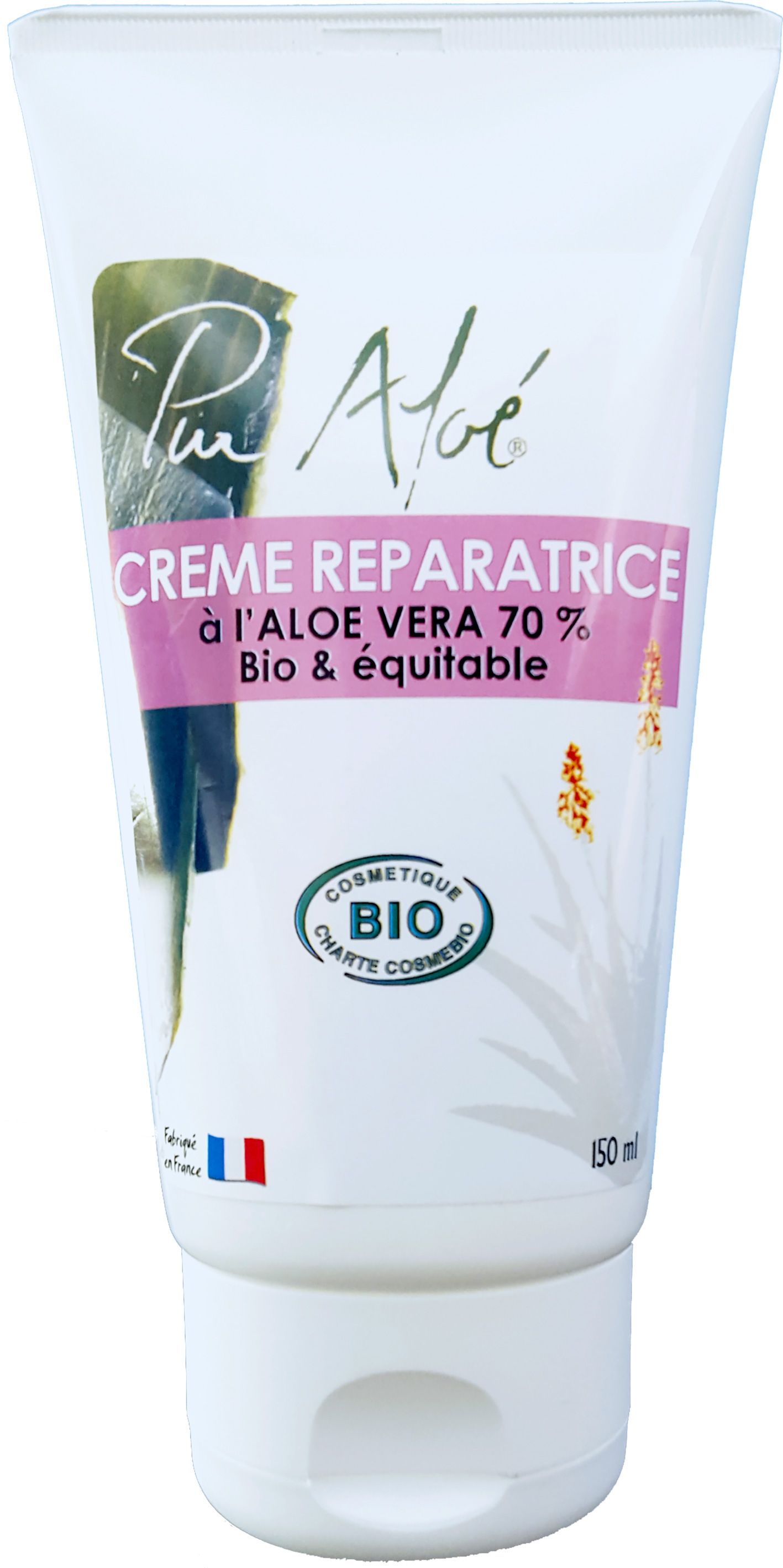 La crème réparatrice à l'aloe vera est un soin adapté à tous les types de peaux. Ce soin hydrate la peau en profondeur. L'aloe vera est particulièrement recommandée pour les problèmes de peaux tels que les irritations et les rougeurs. S'utilise sur le visage, les mains et le corps pour apaiser durablement la peau. Cette crème est composée avec 100 % d'ingrédients d'origine naturelle et labellisée Cosmebio.