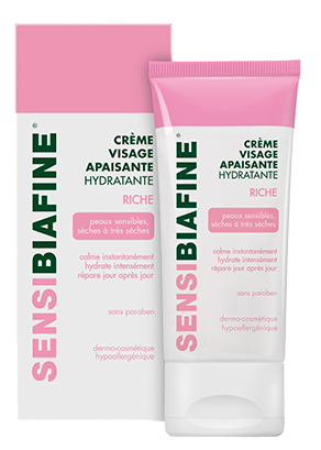 La crème visage hydratante apaisante Sensibiafine apaise, hydrate et régénère le visage et les peaux sensibles. La crème est hypoallergénique, sans colorants et sans parabène.