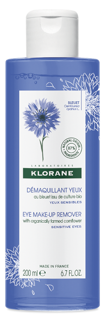 Le démaquillant Klorane au Bleuet est formulé pour démaquiller les yeux sensibles. Il convient également aux porteurs de lentilles. Il élimine efficacement tous les types de maquillage même le waterproof. Ce démaquillant est conçu pour minimiser les risques de réactions allergiques et testé sous contrôle ophtalmologique. Fabriqué en France, il est à 87 % d'ingrédients d'origine naturelle.