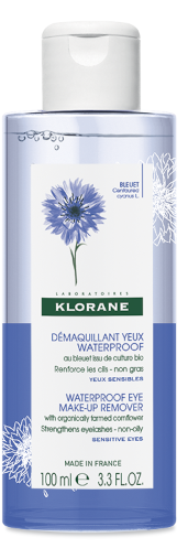 Le démaquillant Klorane au Bleuet est formulé pour démaquiller les yeux sensibles. Il convient également aux porteurs de lentilles. Il élimine efficacement tous les types de maquillage même le waterproof. Ce démaquillant est conçu pour minimiser les risques de réactions allergiques et testé sous contrôle ophtalmologique. Fabriqué en France, il est à 77 % d'ingrédients d'origine naturelle.