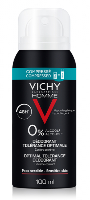 Le déodorant pour hommes de Vichy en format compressé offre 48 heures de protection. Il est hypoallergénique et sans alcool pour convenir aux peaux sensibles et laisser une peau douce, sans irritations.