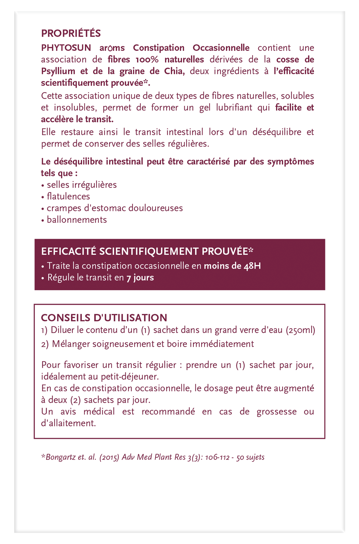 PHYTOSUN arôms Constipation Occasionnelle contient une association de fibres 100% naturelles dérivées de la cosse de Psyllium et de la graine de Chia, deux ingrédients à l’efficacité scientifiquement prouvée*.