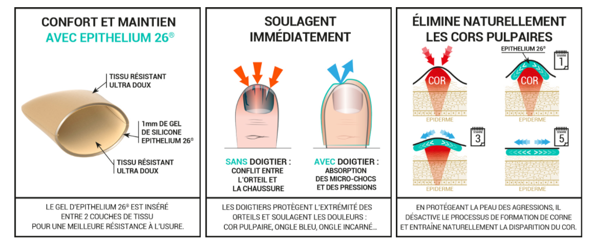 L’extrémité de l’orteil est une zone très sensible. Lorsqu’elle entre en conflit avec la chaussure, les douleurs ressenties sont vives. Si le bout du doigt de pied présente un cor ou des callosité s, un ongle incarné ou s’il est soumis à une succession de traumatismes mécaniques (microchocs) les douleurs sont particulièrement intenses. Pour protéger la pulpe de l’orteil, le doigtier EPITACT® comporte du gel silicone breveté EPITHELIUM 26® qui répartit les pressions et limite les agressions extérieures. Pour limiter l'usure, ce gel est inséré entre deux couches de tissu sur toute la surface du doigtier.