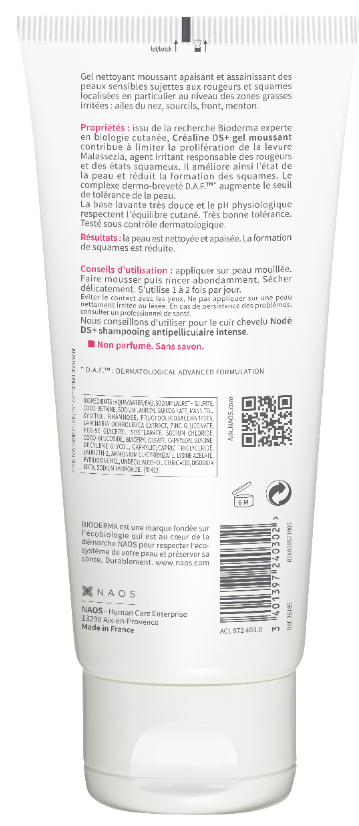 Le gel nettoyant DS+ Créaline du laboratoire Bioderma est recommandé pour nettoyer et apaiser les peaux sensibles et réactives confrontées aux rougeurs. Il est conçu également pour réduire les états squameux sur le visage et le cuir chevelu. Sa formule composée d'une base lavante douce et sans savon qui respecte la peau et préserve son équilibre. Après utilisation, la peau est assainie, les tiraillements sont réduits et la formation de squame diminue. Formule sans parfum et hypoallergénique.