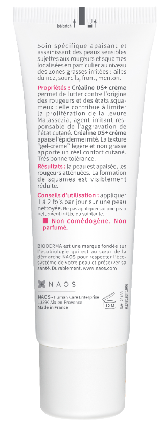Le soin apaisant DS+ Créaline du laboratoire Bioderma est recommandé pour atténuer les rougeurs et les squames des peaux sensibles. Ce soin purifie la peau tout en douceur, il prévient l'apparition des squames et les élimine au niveau des ailes du nez, des sourcils, du front et du menton. Après utilisation les rougueurs sont atténuées et la peau est apaisée.
