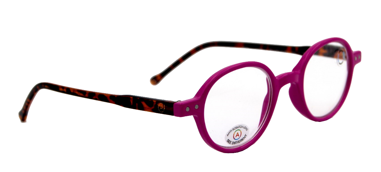 La paire de lunettes loupes Orbit de forme ronde et de coloris rose et marron offre une correction +2.50. Ces lunettes loupes traditionnelles colorées et modernes ne filtrent pas la lumière bleue.