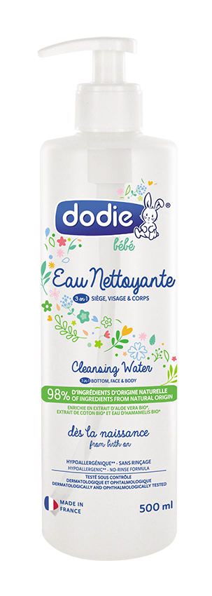 L'eau nettoyante 3 en 1 Dodie est recommandée pour nettoyer la peau des bébés, mêmes les plus fragiles. Elle s'utilise dès la naissance sur le visage, le siège et le corps. Composée d'extrait d’Aloe vera Bio, d'extrait de Coton Bio et d'Hamamélis Bio, elle nettoie tout en douceur pour une peau propre et fraiche. Sa texture non-collante apporte le confort nécessaire et laisse une agréable odeur.
