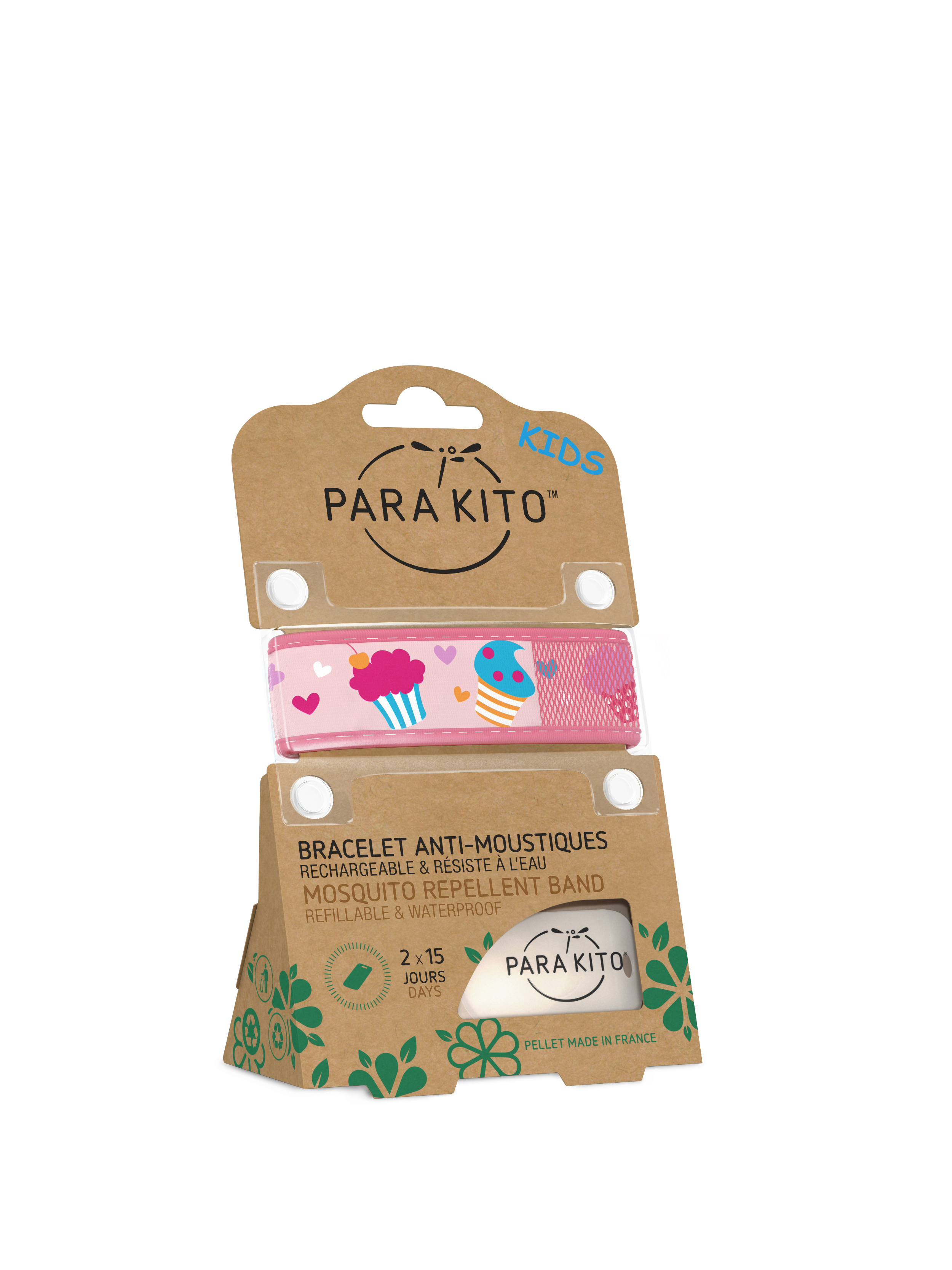Le bracelet anti-moustiques Parakito peut etre porté autour du poignet ou de la cheville. Ce bracelet enfant à motif "cupcakes" en néoprène est fourni avec deux plaquettes imprégnées d'une formule à base d'huiles essentielles favorisant l'éloignement des moustiques.