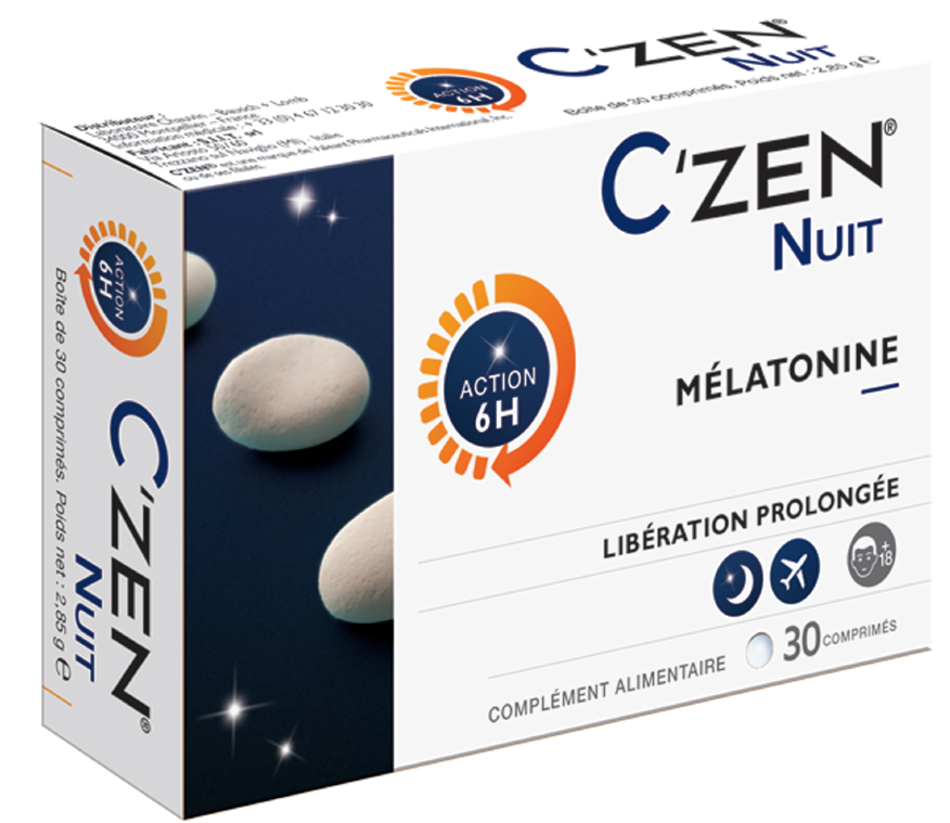 C’ZEN Nuit est un complément alimentaire à base de la mélatonine à libération prolongée. La mélatonine permet d'atténuer les effets du décalage horaire lors des voyages par exemple. Grâce à son actif breveté, C’ZEN Nuit reproduit la sécrétion naturelle de mélatonine pendant la nuit et reste effective 6 heures dans le corps après son ingestion.