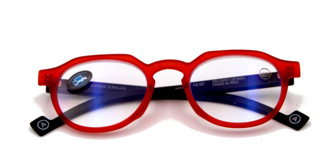 La paire de lunettes loupes de forme Pantos de la gamme Karma propose une correction +2.00, dans un coloris rouge et noir. C'est un modèle pour femme qui est équipé de verres traités dans la masse pour filtrer un maximum de lumière bleue nocives pour l’œil et avec un antireflet sur la face externe.
