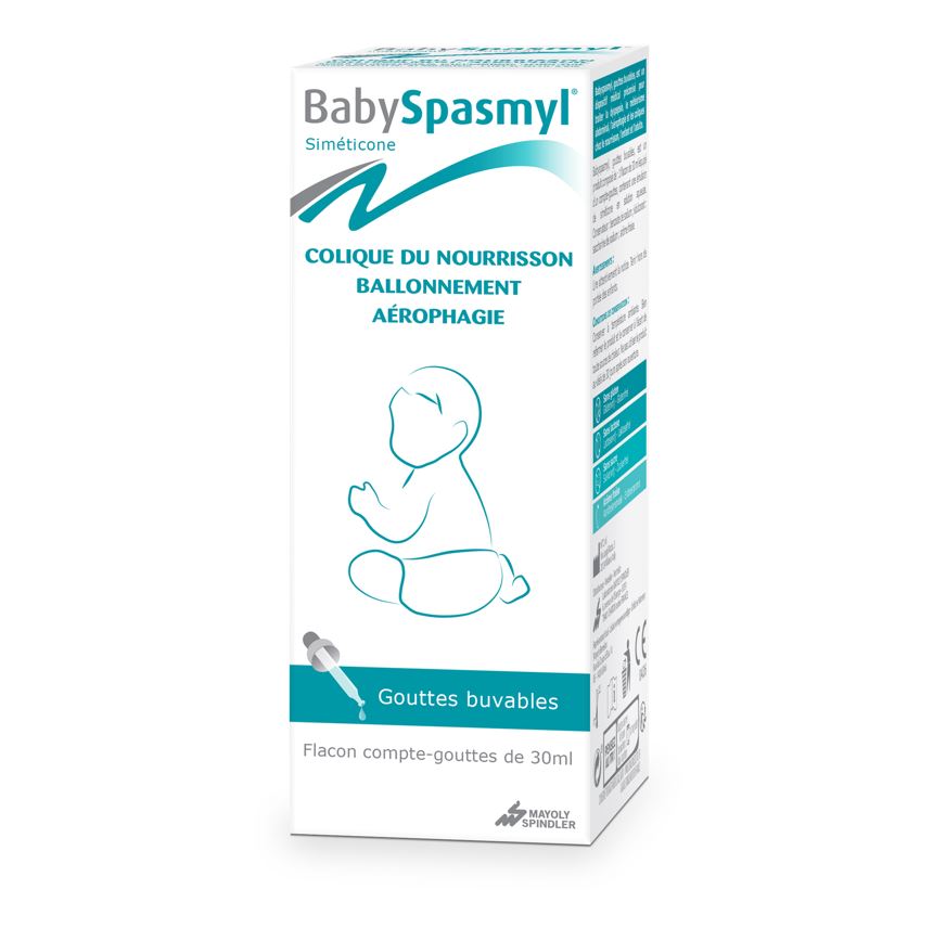 BabySpasmyl est un dispositif médical qui se présente sous la forme d'un flacon compte-gouttes de 30ml qui contient une émuslion de siméticone en solution aqueuse. BabySpasmyl est un dispositif médical à action physique et mécanique à base de siméticone qui aide à soulager la colique du nourrisson, l'aérophagie, les ballonnement et les troubles digestifs chez l'adulte, l'enfant et le nourrisson à partir de 1 mois.
