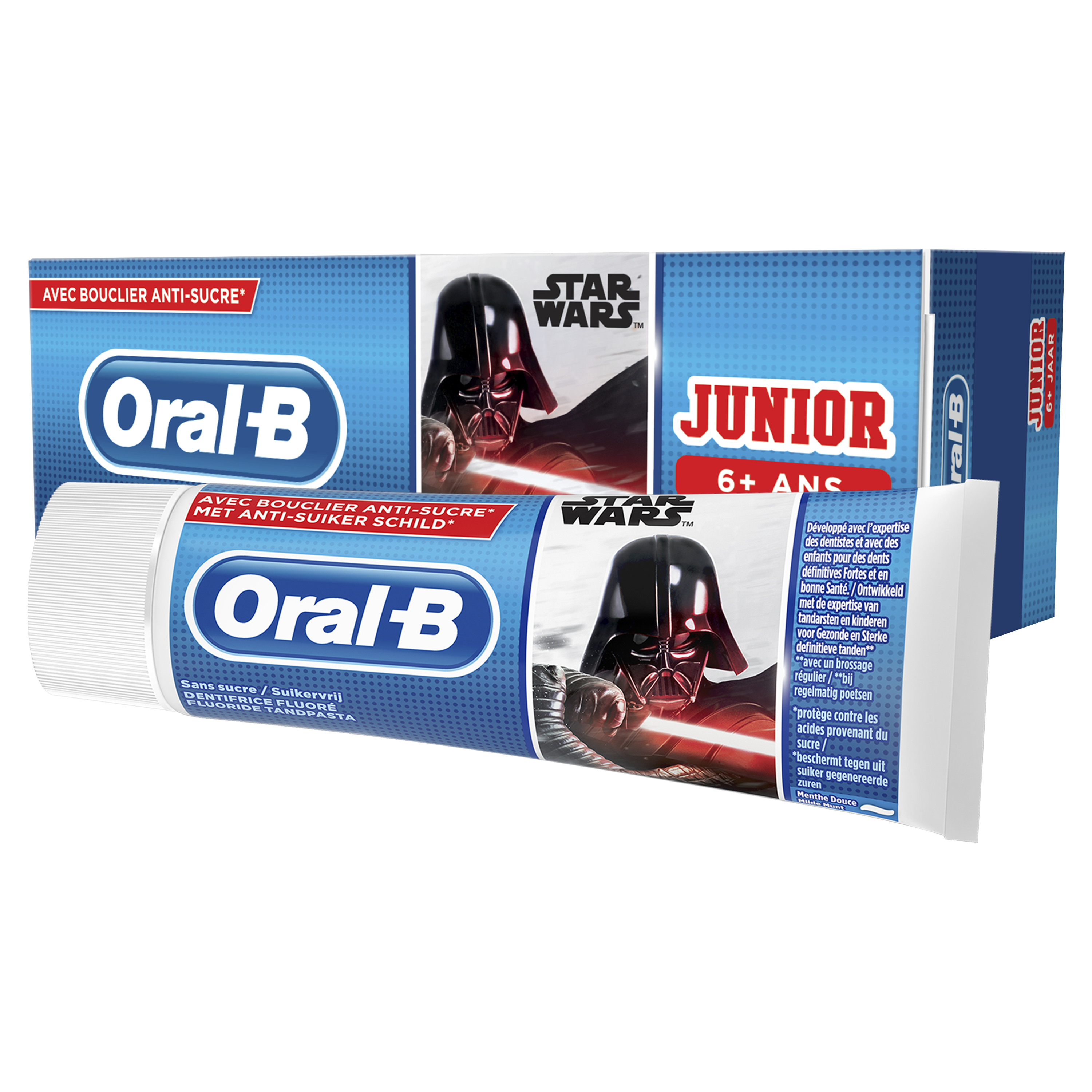 Le dentifrice Oral-B Junior arborant les personnages de Star Wars a été élaboré avec l’aide de dentistes pour permettre aux enfants de prendre en main leur santé bucco-dentaire. Il protège les dents des acides et des sucres présents dans la nourriture de tous les jours. Son arôme de menthe douce est idéal pour les grands enfants.