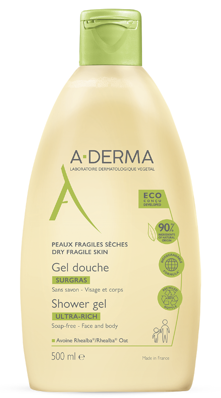 Le Gel douche surgras A-DERMA nettoie, nourrit et prévient le dessèchement. Sa formule est particulièrement enrichie en émollients pour une hydratation dès la douche.