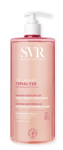 TOPIALYSE GEL LAVANT, un nettoyant doux protecteur anti-dessèchement qui protège de la tête aux pieds les peaux sensibles et sèches de toute la famille.