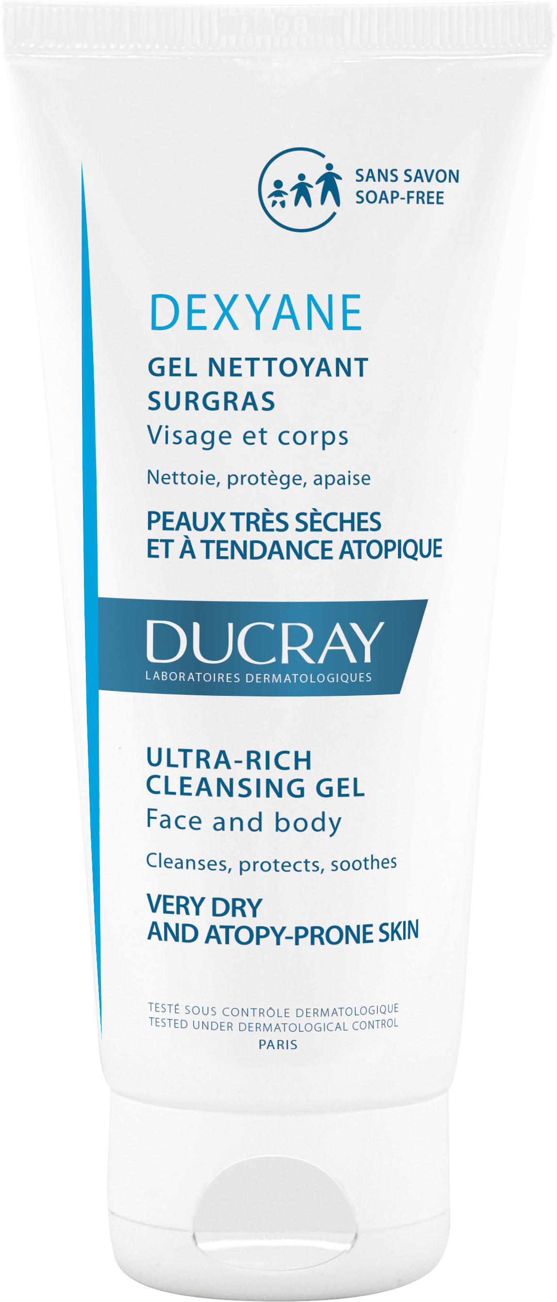 Le gel nettoyant surgras Dexyane du Ducray est recommandé pour nettoyer les peaux très sèches à tendance atopiques de toute la famille tout en douceur. Il s'utilise sur le corps et le visage et élimine les impuretés tout en protégeant la peau. Après utilisation, la peau est propre, apaisée et les sensations d'irritations sont atténuées. Formule testée sous contrôle dermatologique.
