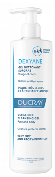 Le gel nettoyant surgras Dexyane du Ducray est recommandé pour nettoyer les peaux très sèches à tendance atopiques de toute la famille tout en douceur. Il s'utilise sur le corps et le visage et élimine les impuretés tout en protégeant la peau. Après utilisation, la peau est propre, apaisée et les sensations d'irritations sont atténuées.