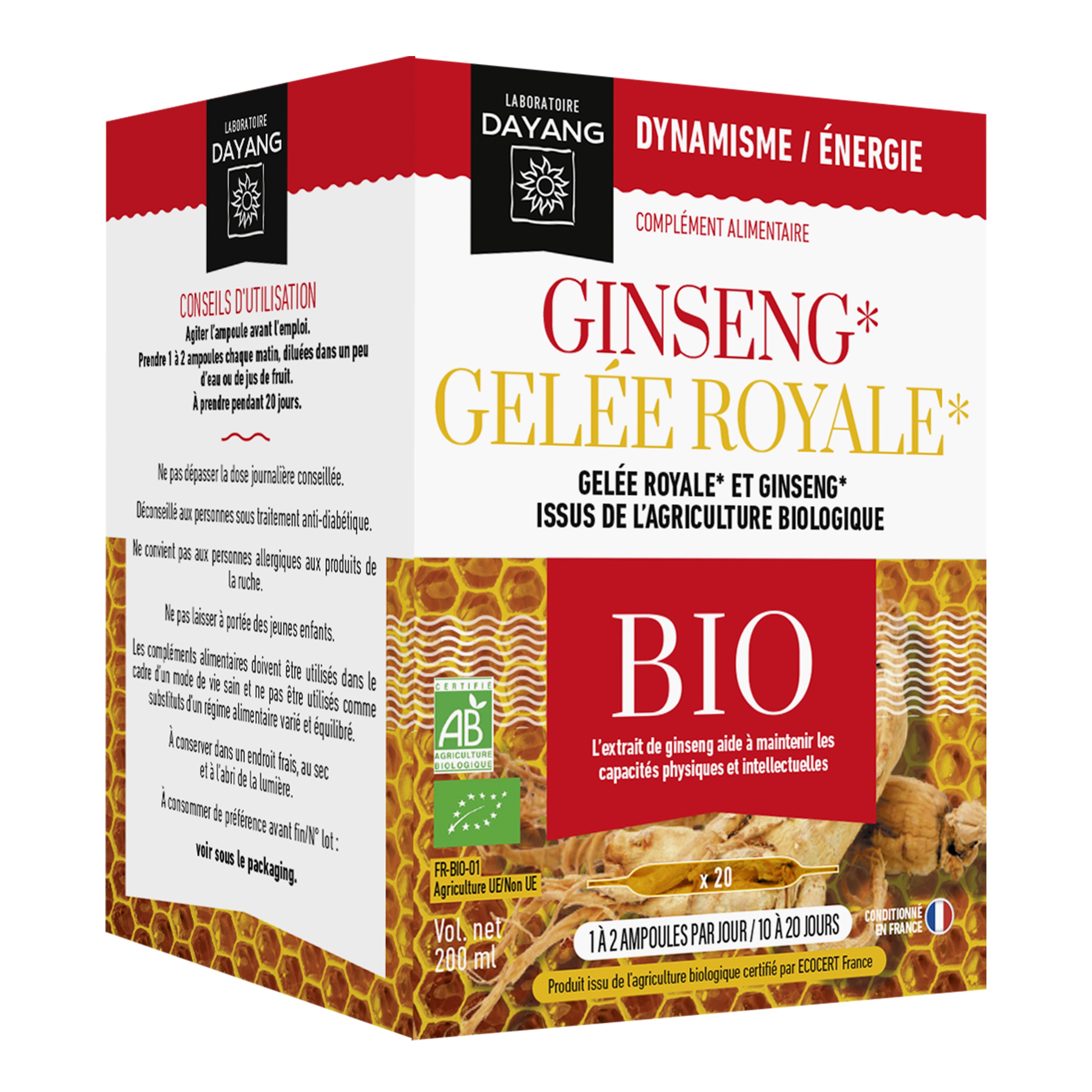 Le complexe ginseng gelée royale BIO Dayang associe le ginseng au produit phare de la ruche, réservé à la reine des abeilles. Le ginseng aide à maintenir les capacités physiques et intellectuelles en cas de faiblesse, d'épuisement, de fatigue et de perte de concentration. Il aide à mantenir de bonnes performances cognitives et favorise les performances de la mémoire. Conditionné en France. * Produit issu de l'agriculture biologique certifié par ECOCERT France sas FR-BIO-01.
