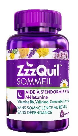 Avec le nouveau complément alimentaire ZzzQuil SOMMEIL, c’est naturel de bien dormir ! Ces gommes à mâcher vous aideront à vous endormir plus vite, sans dépendance ni somnolence au réveil. ZzzQuil SOMMEIL contient de la mélatonine, une hormone naturellement présente dans l'organisme pour s'endormir plus vite, de la vitamine B6 qui contribue à réduire la fatigue et une association de 3 plantes : valériane, camomille, lavande. Sans arôme, colorant, édulcorant ni conservateur artificiels. Sans lactose ni gluten.
