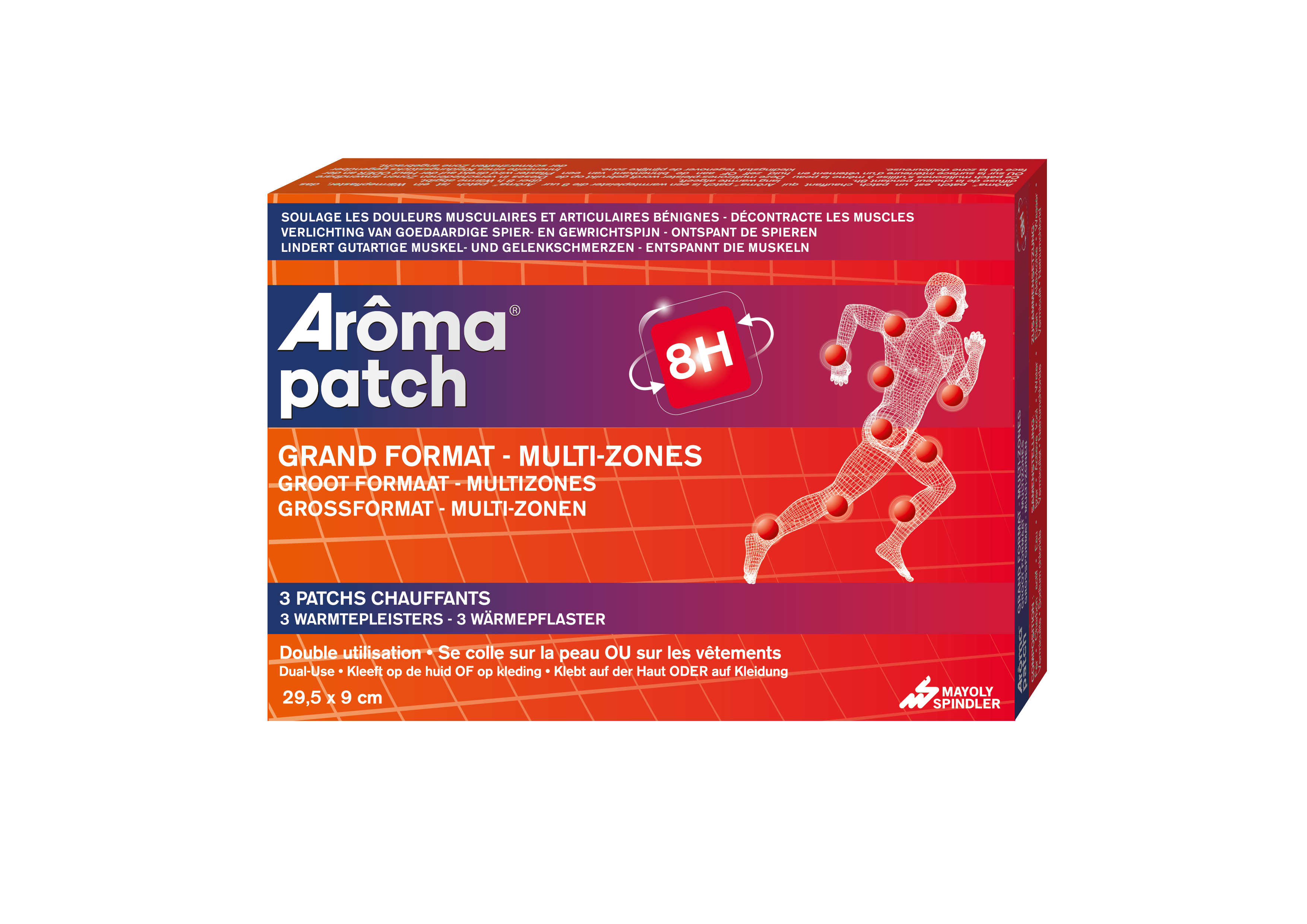 Aroma patch grand format du laboratoire Mayoly Spindler est un patch chauffant recommandé pour soulager les douleurs musculaires et articulaires bénignes de manière temporaire grâce à la diffusion de chaleur pendant 8 heures. Ce patch s'utilise aussi pour décontracter les muscles, il se place à même la peau ou à la surface intérieure d’un vêtement en face de la zone douloureuse. Aroma patch grand format est particulièrement adapté à une application sur le dos, sur les épaules, la nuque, le bras ou encore sur le mollet.