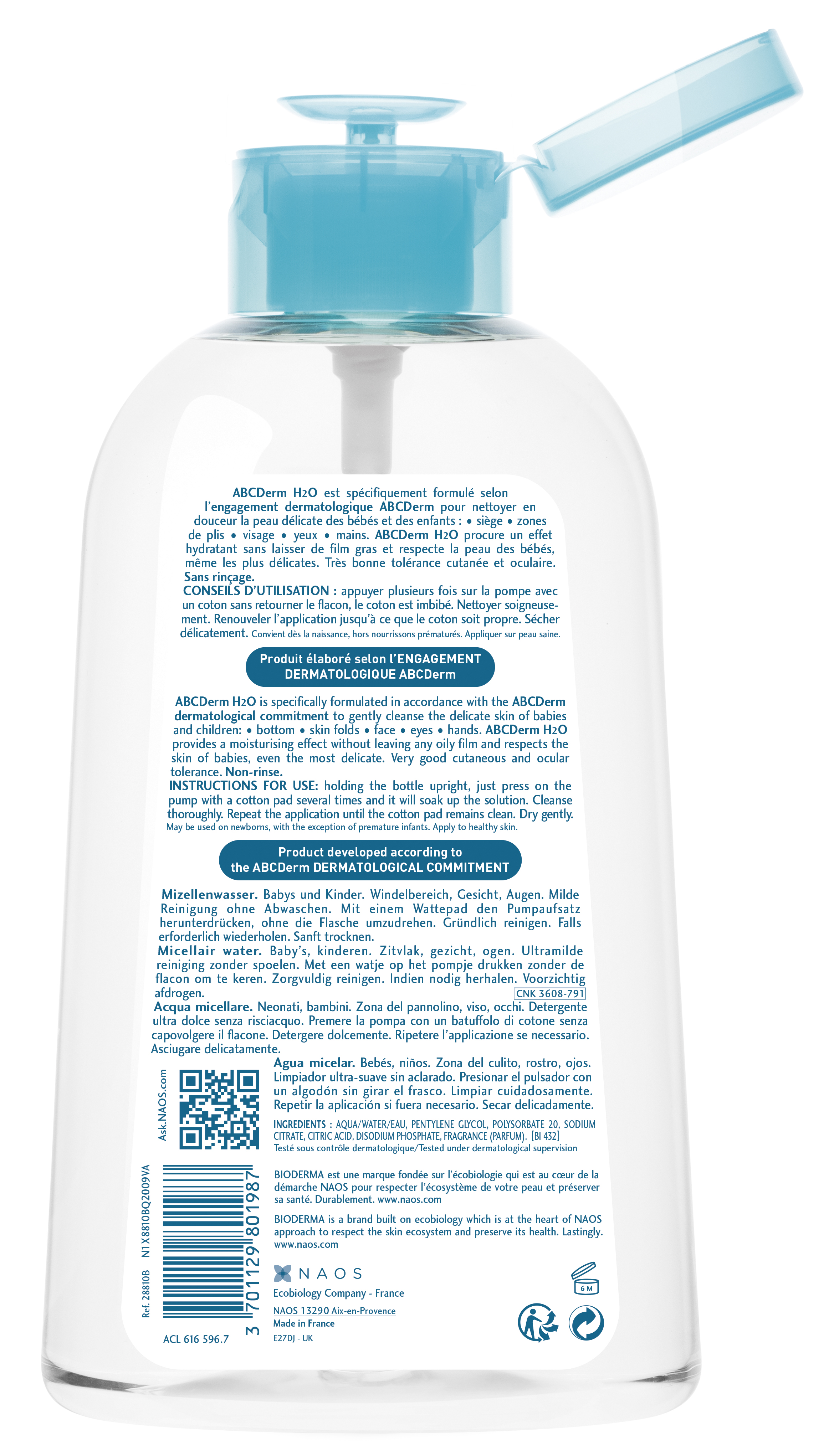 La solution micellaire ABCDerm H2O est conçue pour la toilette de bébé. Elle permet de nettoyer en douceur le siège, le visage et les yeux de bébé.