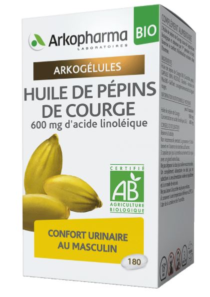 L'huile de pépins de Courge boite d'Arkogélules est un complément alimentaire qui favorise le confort urinaire chez l'homme.